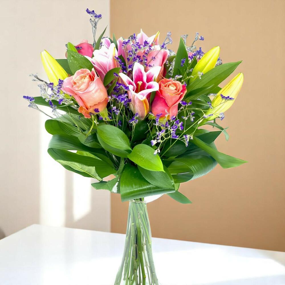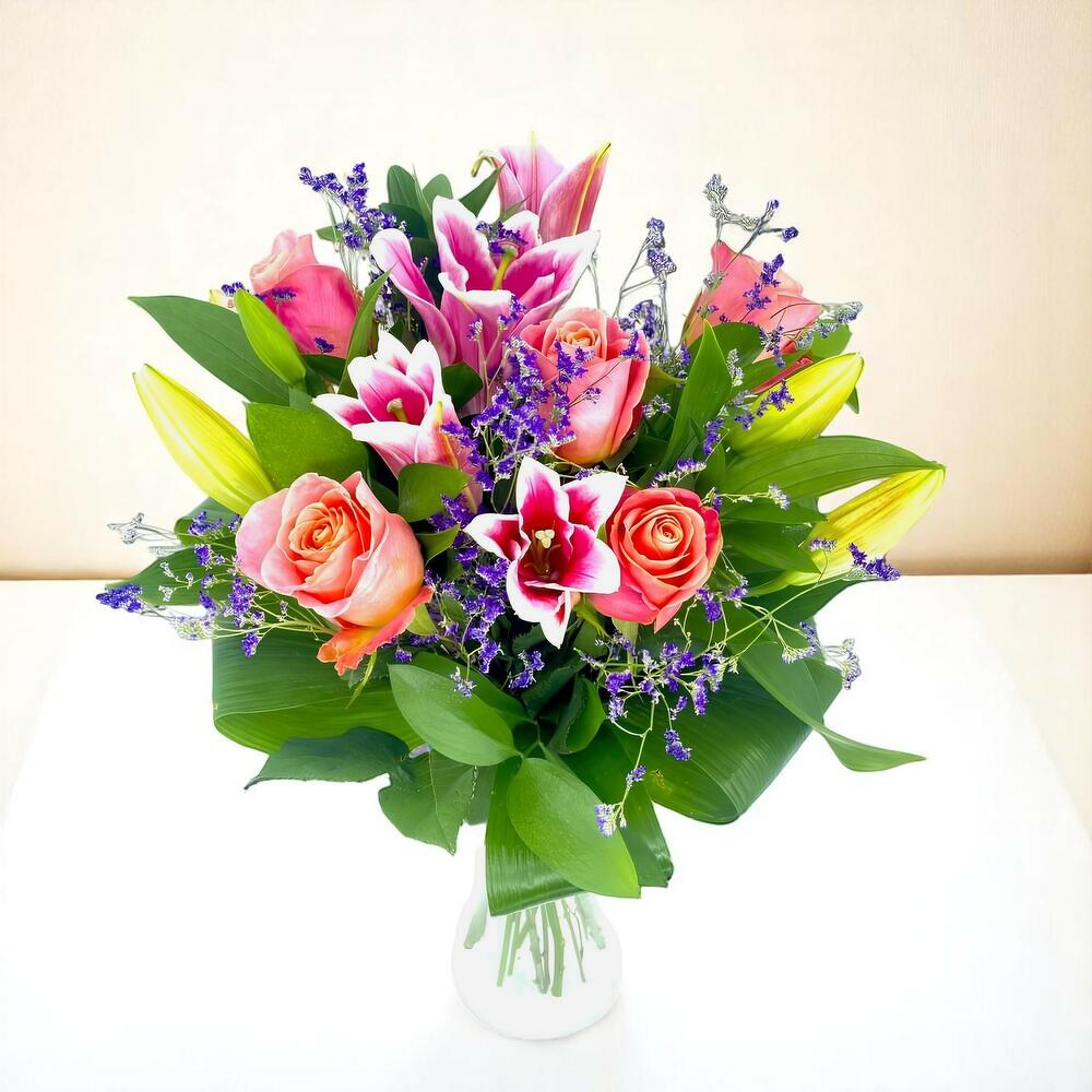 Ruscus - 4 ud. Aspidistra - 4 ud. rosa rosada - 5 ud. limonium morado - 3 ud. lilium oroental rosa - 3 ud.