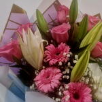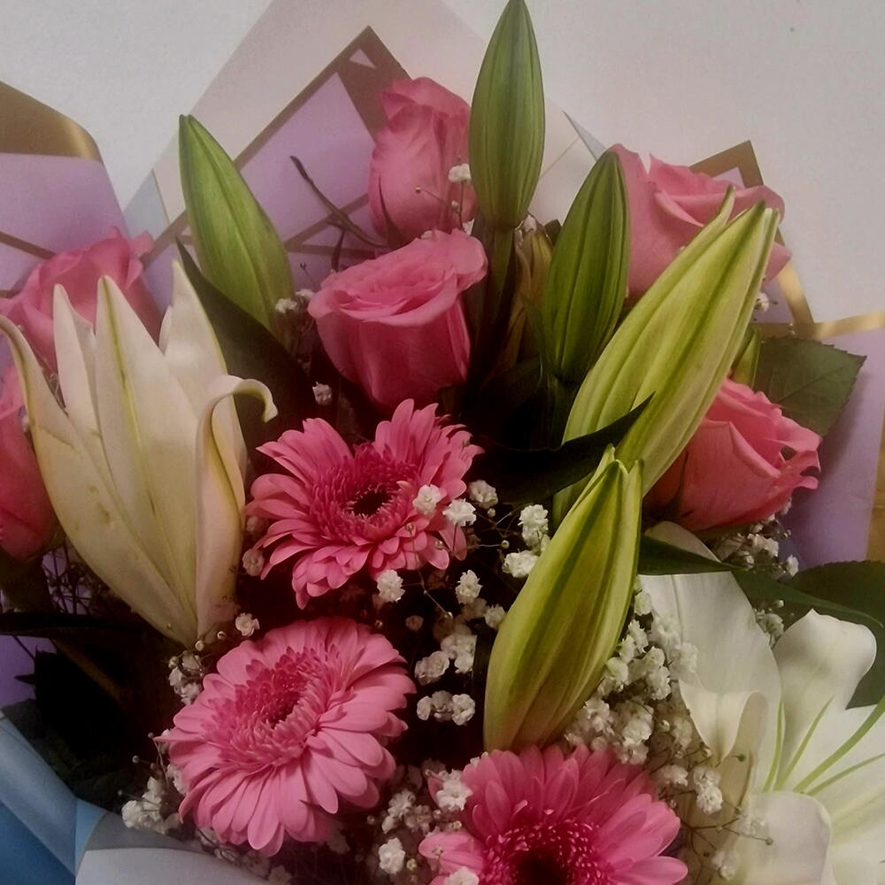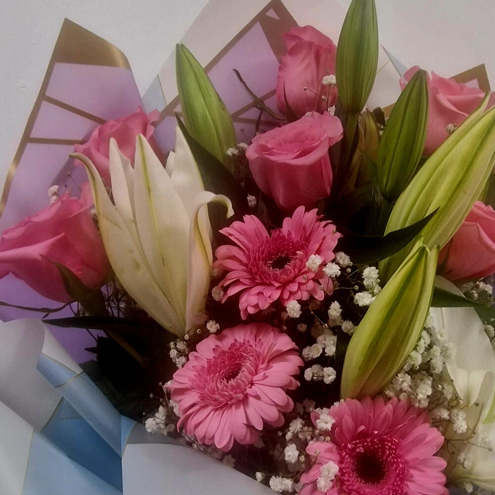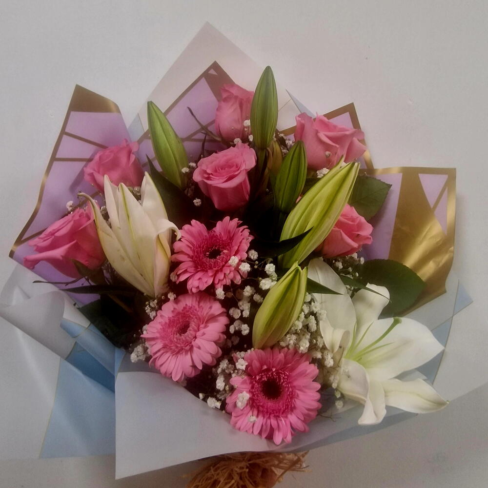 Un ramo exquisito y sofisticado que combina la pureza del lilium blanco, la delicadeza de las rosas rosas y la alegría de las gerberas. - *Lilium Blanco*: Símbolo de pureza y elegancia, aporta un toque de sofisticación al ramo. - *Rosas Rosas*: Representan el amor y la gratitud, añadiendo un toque romántico y emotivo. - *Gerberas*: Aportan un toque de alegría y frescura, completando el ramo con un estallido de colo