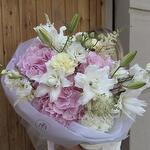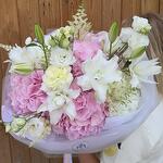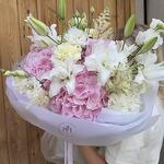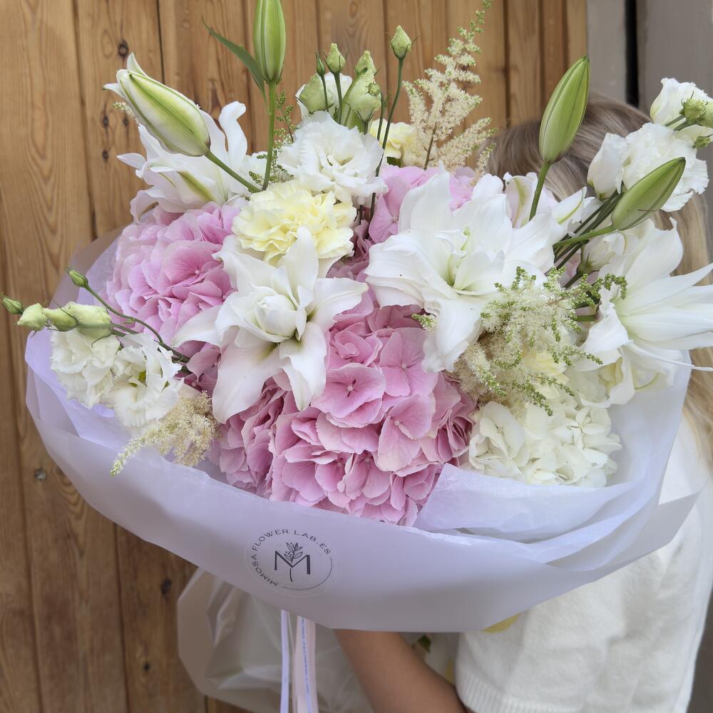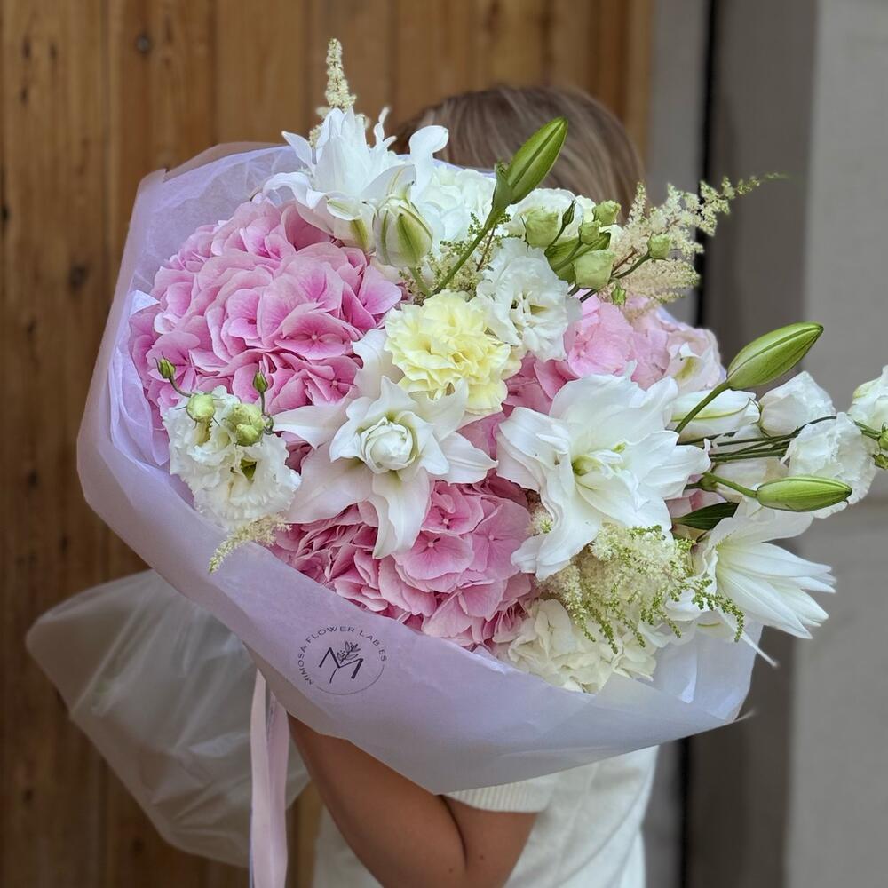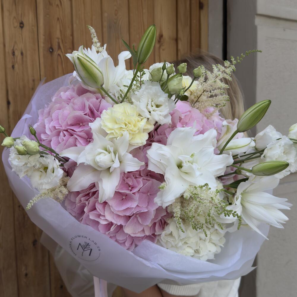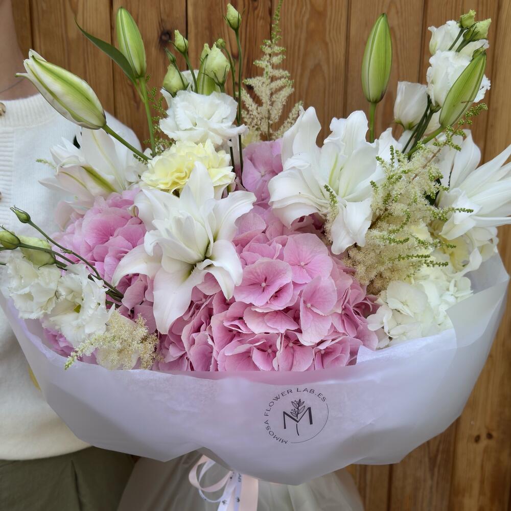 Hydrangea - 6 ud. Lisianthus - 3 ud. dianthus - 4 ud. packaging design - 2 ud. astilbe - 5 ud. ribbon satin - 2 ud. chrysal - 1 ud. lirio roselily - 2 ud.