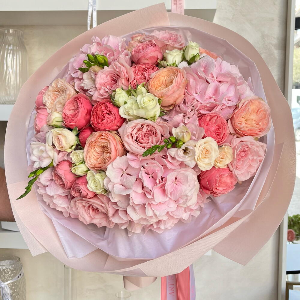 Spray rose - 7 ud. Freesia - 3 ud. packaging - 3 ud. Pink O'Hara rosa - 4 ud. peón rosa - 4 ud. hedrnageas - 4 ud.