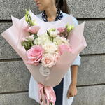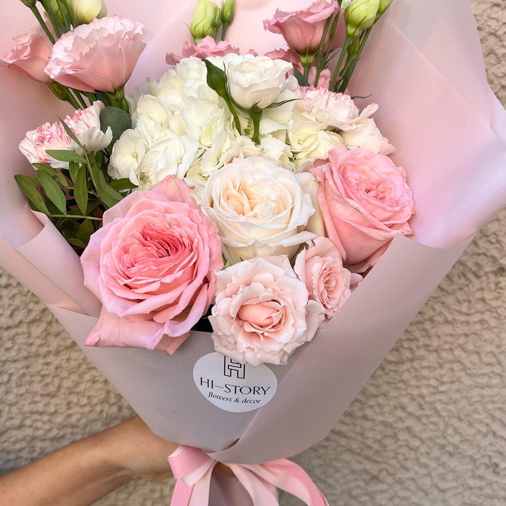 Un ramo delicado y romántico que combina los tonos suaves del rosa y el blanco, ideal para expresar amor, gratitud o admiración. Las rosas rosadas y blancas, junto con los elegantes lisianthus y claveles, crean una armonía perfecta de texturas y colores. Envuelto en un elegante papel satinado rosa y decorado con una cinta a juego, este diseño transmite pureza y ternura. Perfecto para ocasiones como cumpleaños, aniversarios o simplemente para alegrar el día de alguien especial.