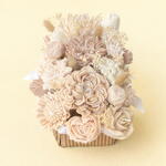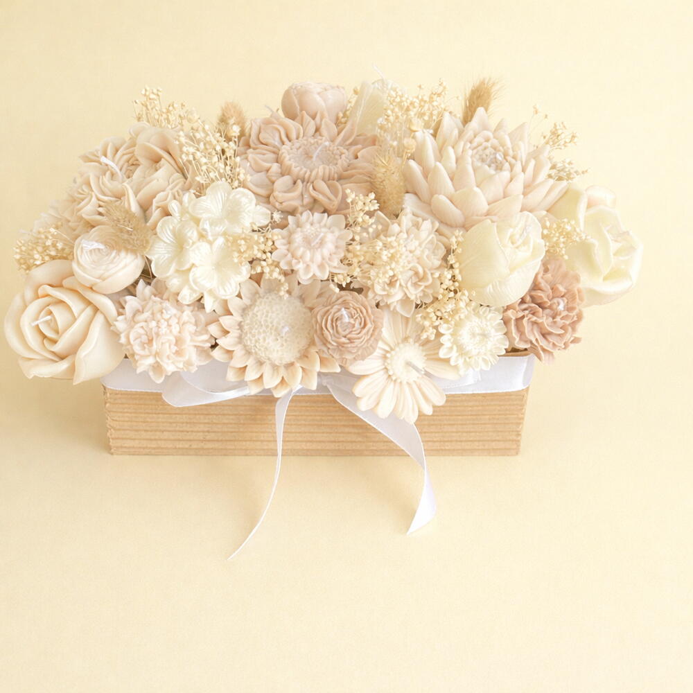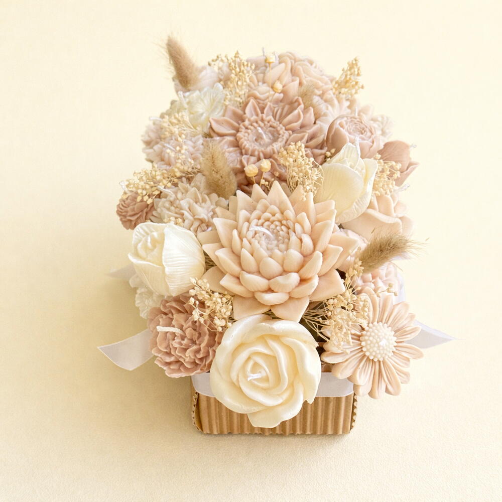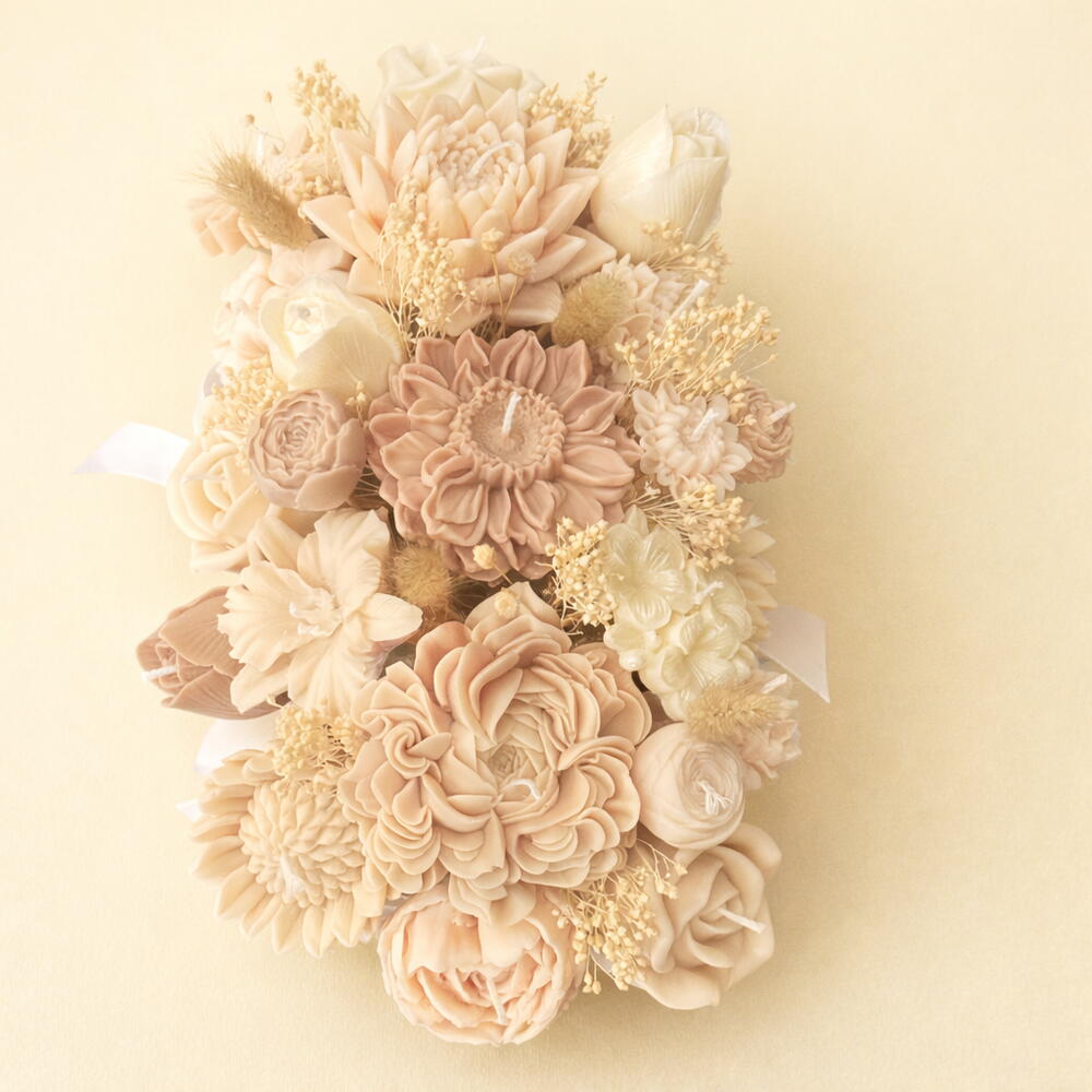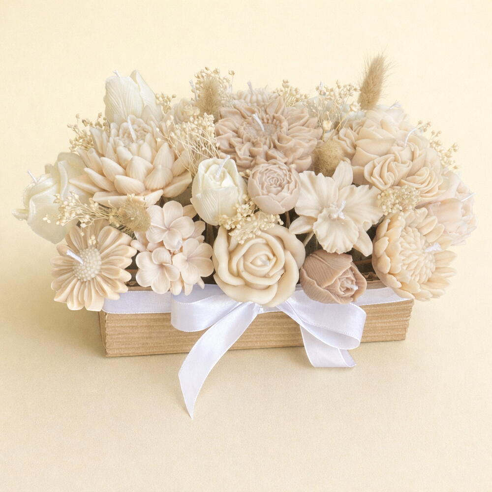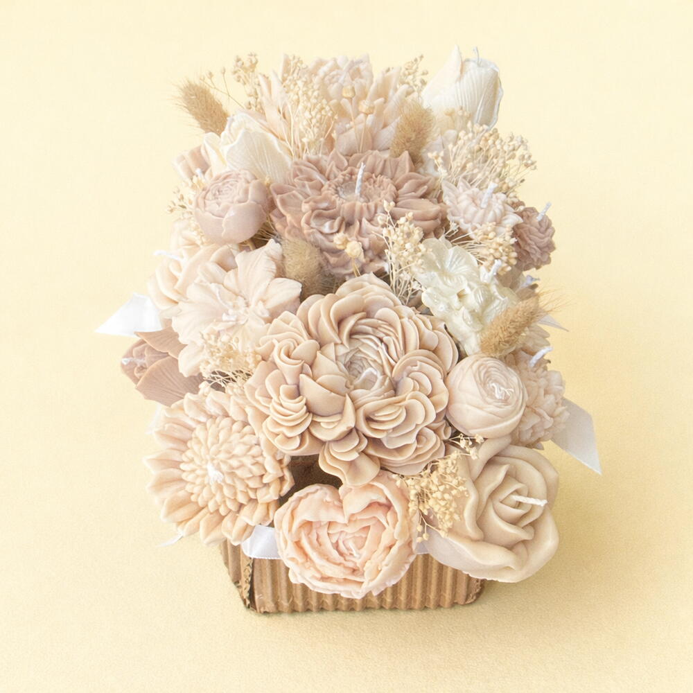 Centro floral de 25 flores en cera con paleta nude cálida y tonos arena sofisticados. Diseñado para bodas, eventos de lujo y para tu hogar u oficina. 2026. Elegancia atemporal y artesanal.