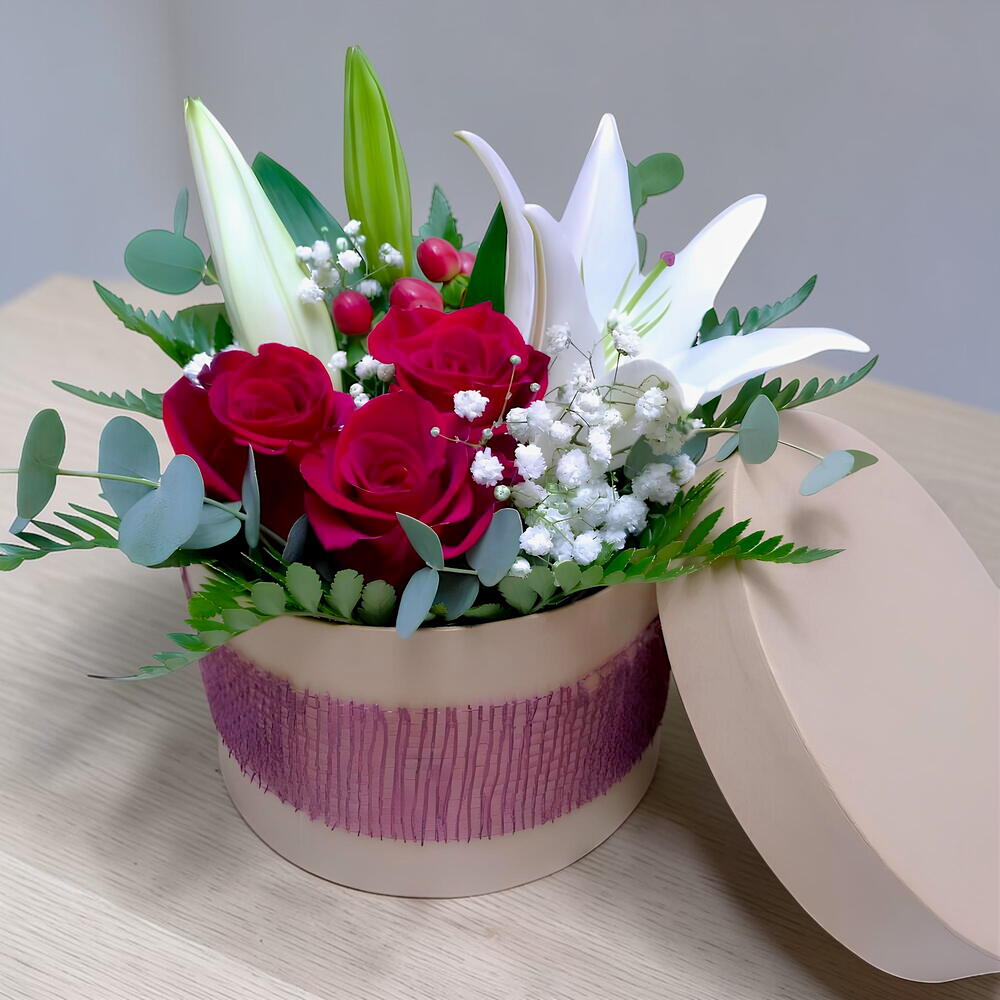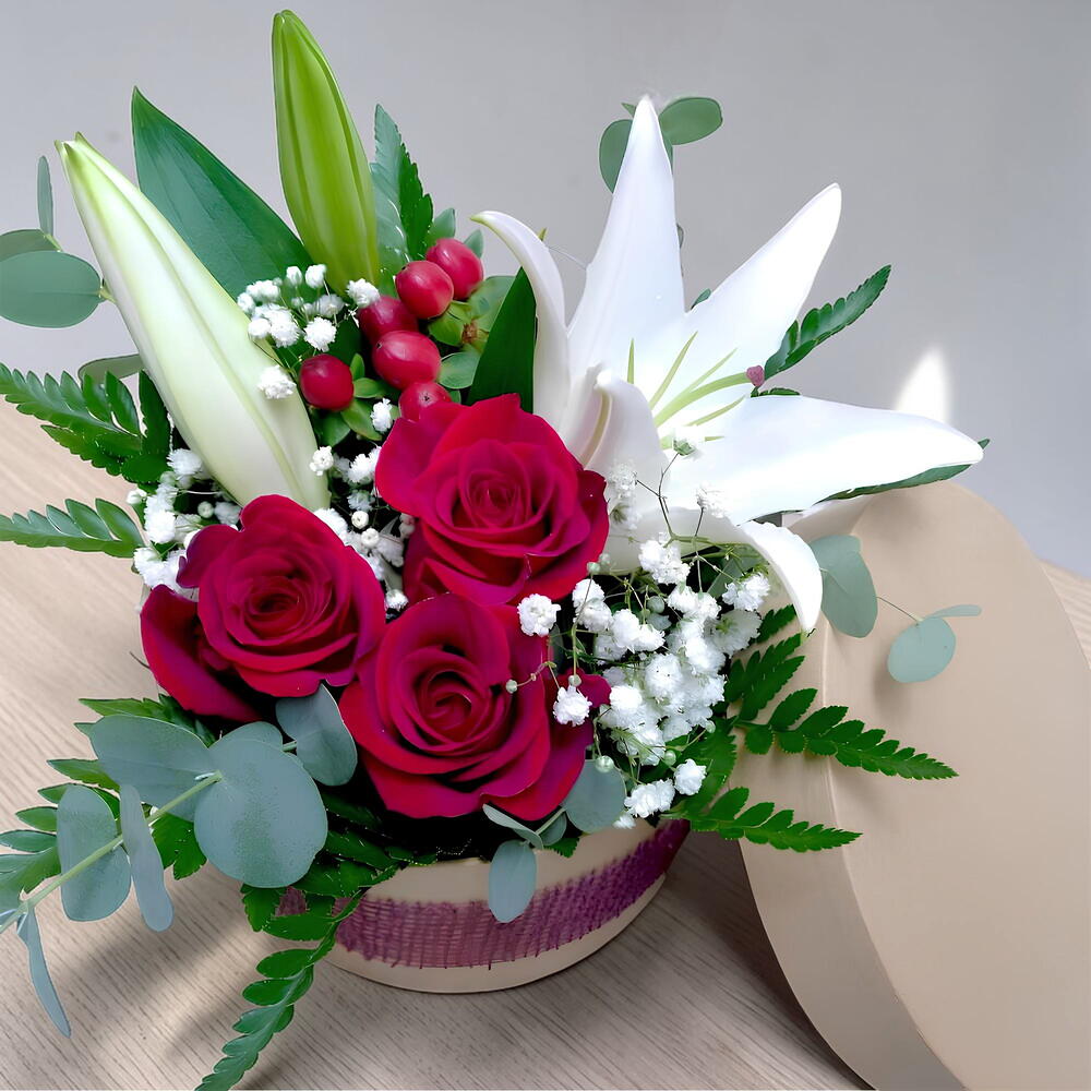 Este centro de flores se compone de una hermosa mezcla de Gypsophila, Lilium, eucalipto y rosas. Una elegante composición que combina colores y texturas para crear un arreglo floral encantador y sofisticado. Ideal para aportar un toque de frescura y belleza a cualquier espacio.