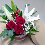 Gypsophila - 3 ud. Lilium - 2 ud. eucalipto - 3 ud. rosas - 3 ud. helecho - 3 ud. hipéricum rojo - 1 ud.