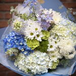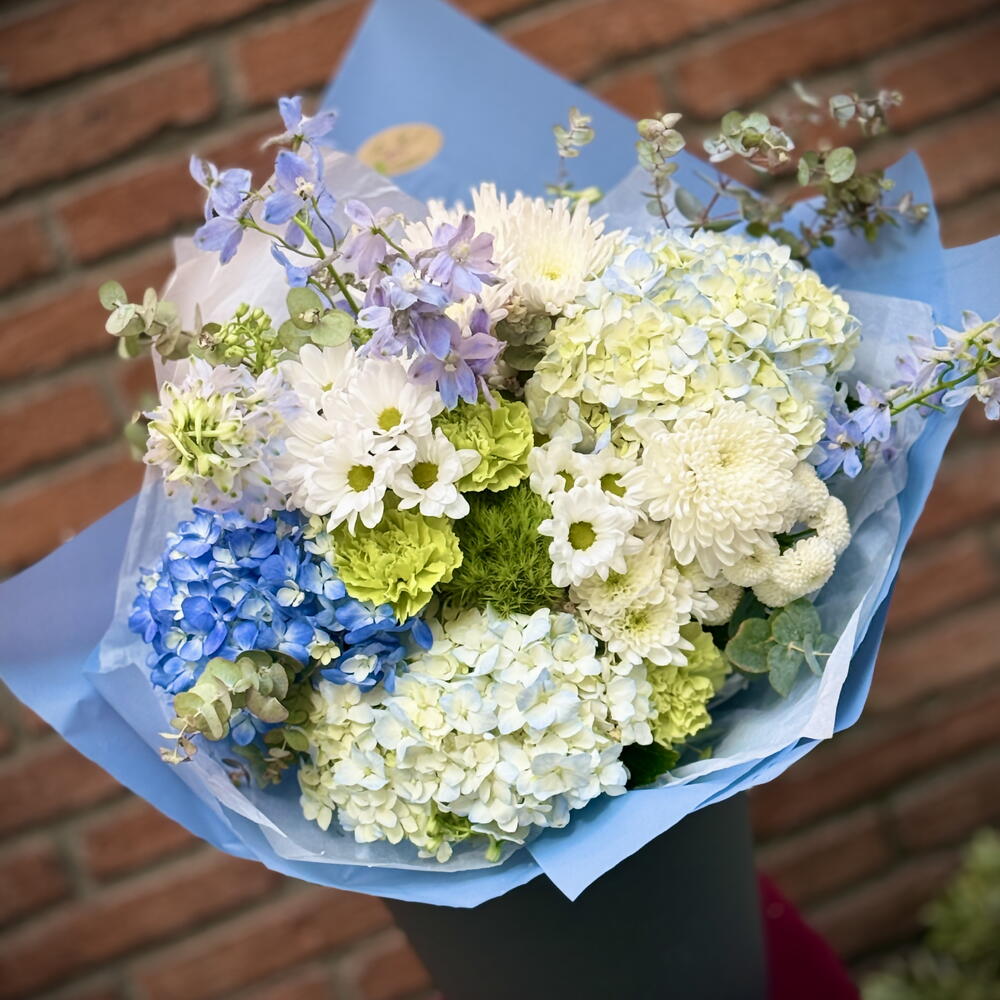 hortensia azul - 2 ud. eucalipto decorativo - 3 ud. hortensia blancaverde muy claro - 2 ud. crisantemo blanco tipo botón - 2 ud. crisantemo ramificado blanco - 3 ud. delphinium azul claro - 3 ud. clavel verde lima - 2 ud. bola de musgo verde (dianthus trick o musgo decorativo) - 1 ud. allium blanco (tipo ornamental) - 1 ud.