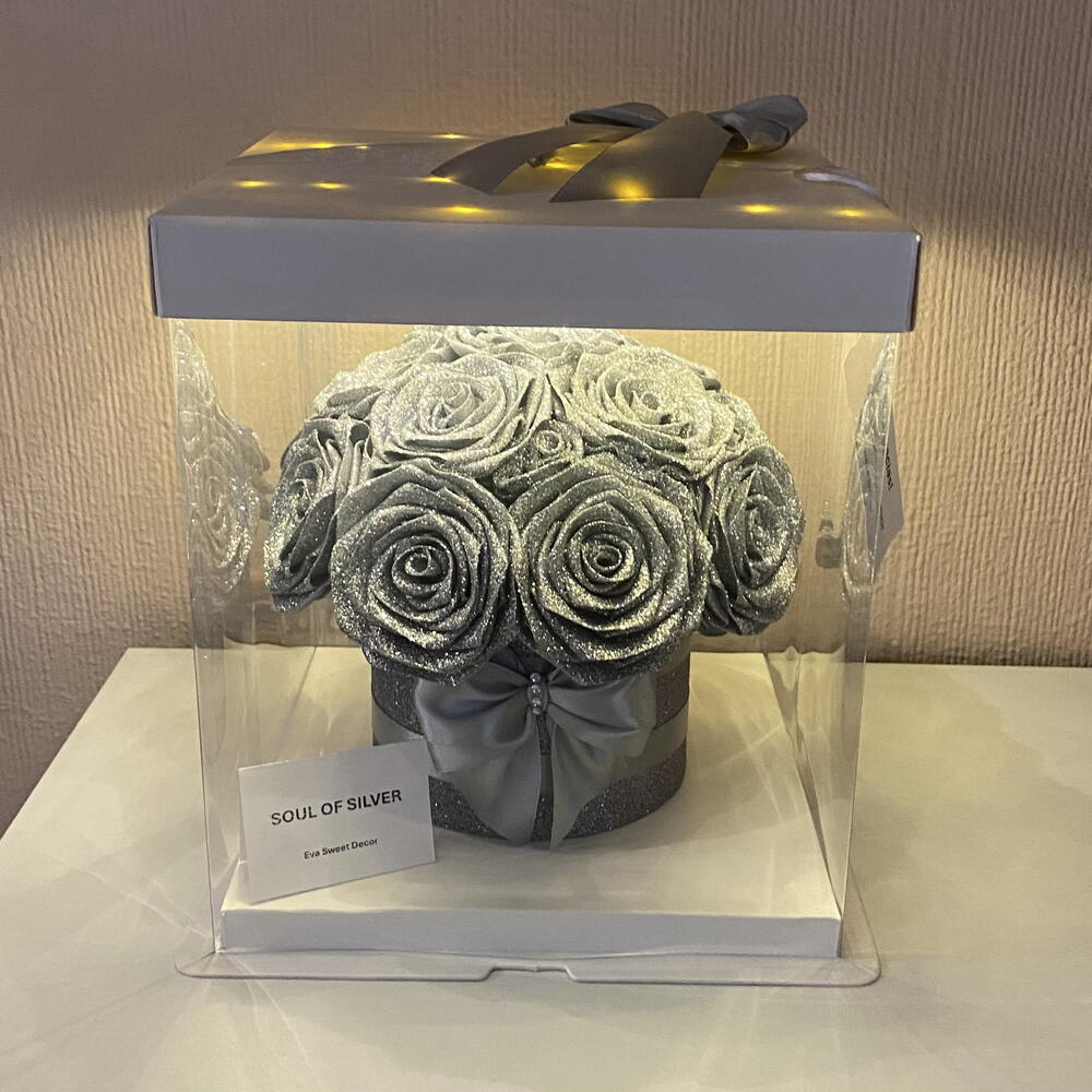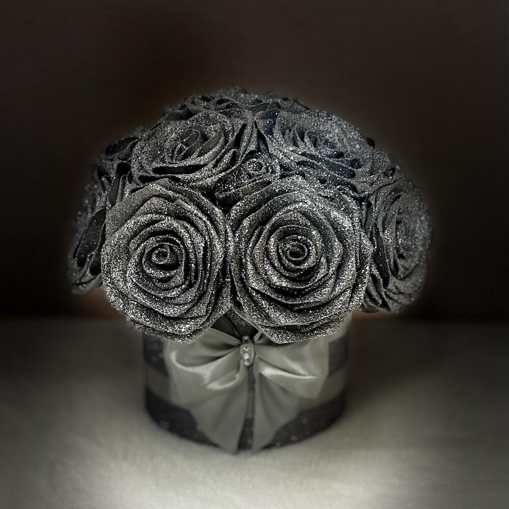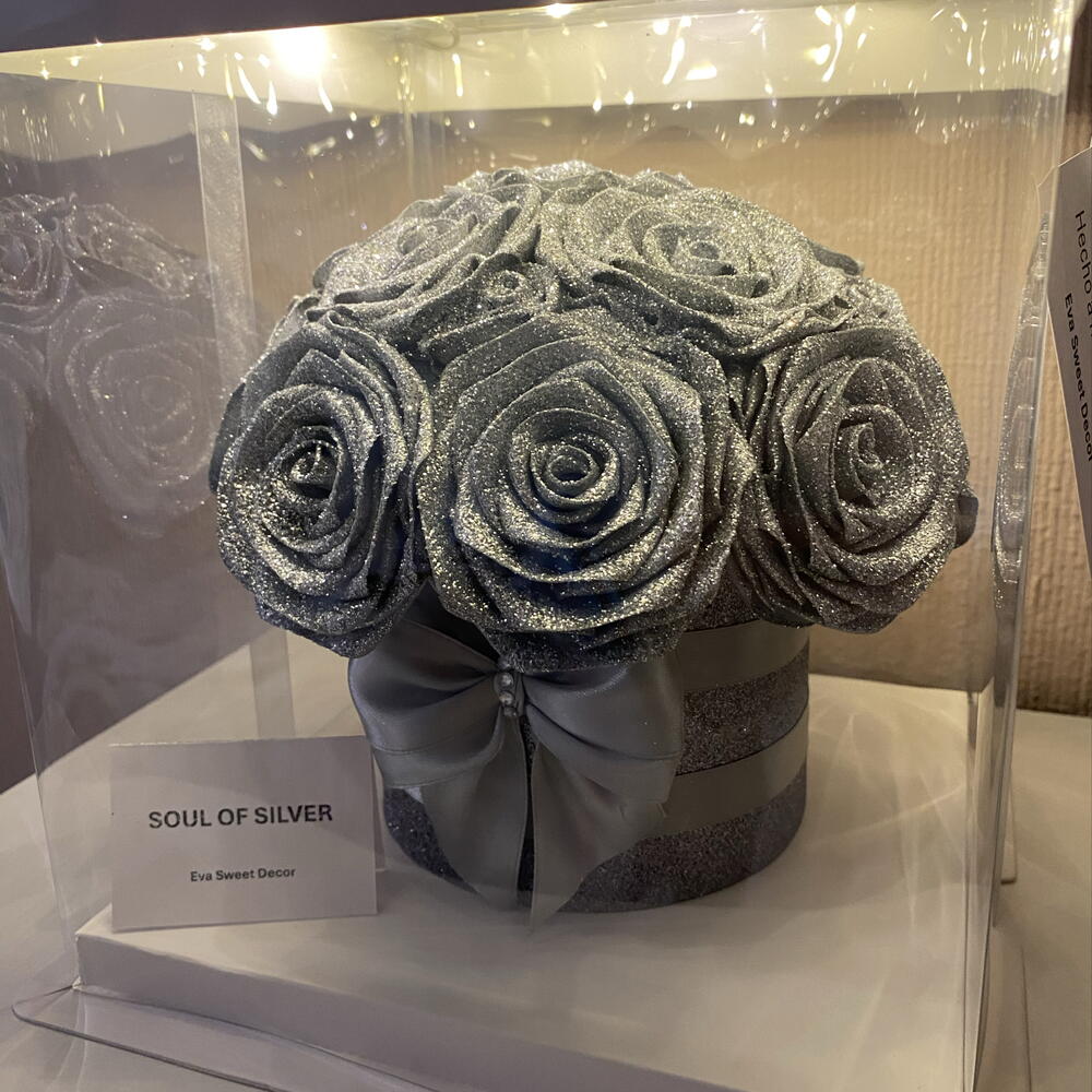 El alma de la plata de la colección de lujo Monochrome. ¡Diseño propio! ¡En una hermosa caja transparente con luces LED! La elección perfecta para el Día de la Mujer, cumpleaños o cualquier ocasión. ¡La auténtica elegancia de la plata! ¡Más que una rosa! ¡Esta es una decoración para el hogar completamente única, especial y de diseño! ¡EDICIÓN LIMITADA! ¡Cada rosa está hecha a mano! La caja plateada con 16 rosas eternas de plata, hermosas y vibrantes, crea una experiencia verdaderamente especial. La elección perfecta: - Si te encanta la elegancia pura - Si quieres regalar una experiencia inolvidable - Si no te conformas con lo común - Para cualquier ocasión que quieras hacer especial