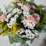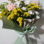 Solidago - 6 ud. margaritas - 6 ud. claveles - 5 ud. verdes de temporada - 5 ud. pape coreano - 2 ud. papel grabado seda - 1 ud.