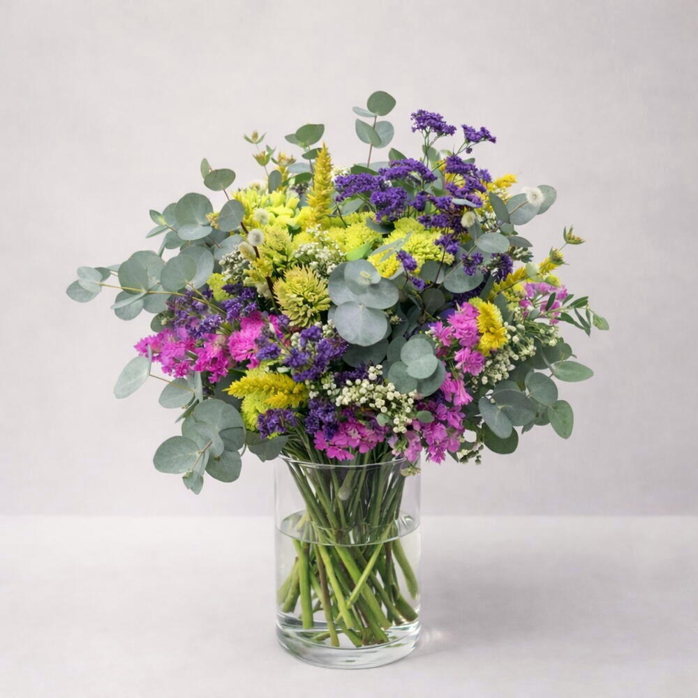 Un ramo silvestre lleno de color y naturalidad que recuerda a un prado en plena floración. La combinación de flores amarillas, violetas y rosadas crea una composición viva, ligera y muy armoniosa. Las pequeñas flores silvestres aportan un encanto natural y una sensación de frescura recién recogida del campo. Las ramas de eucalipto añaden volumen, textura y un elegante tono verde plateado que equilibra el arreglo. Este ramo es perfecto para quienes aman los estilos naturales, luminosos y llenos de vida. Puede decorar cualquier espacio o convertirse en un regalo alegre y delicado para cualquier ocasión. Para mantener las flores frescas por más tiempo, coloque el ramo en agua limpia, corte los tallos en diagonal antes de colocarlo en el jarrón y cambie el agua cada 1–2 días. Mantenga el ramo en un lugar fresco, lejos del sol directo, corrientes de aire y fuentes de calor.