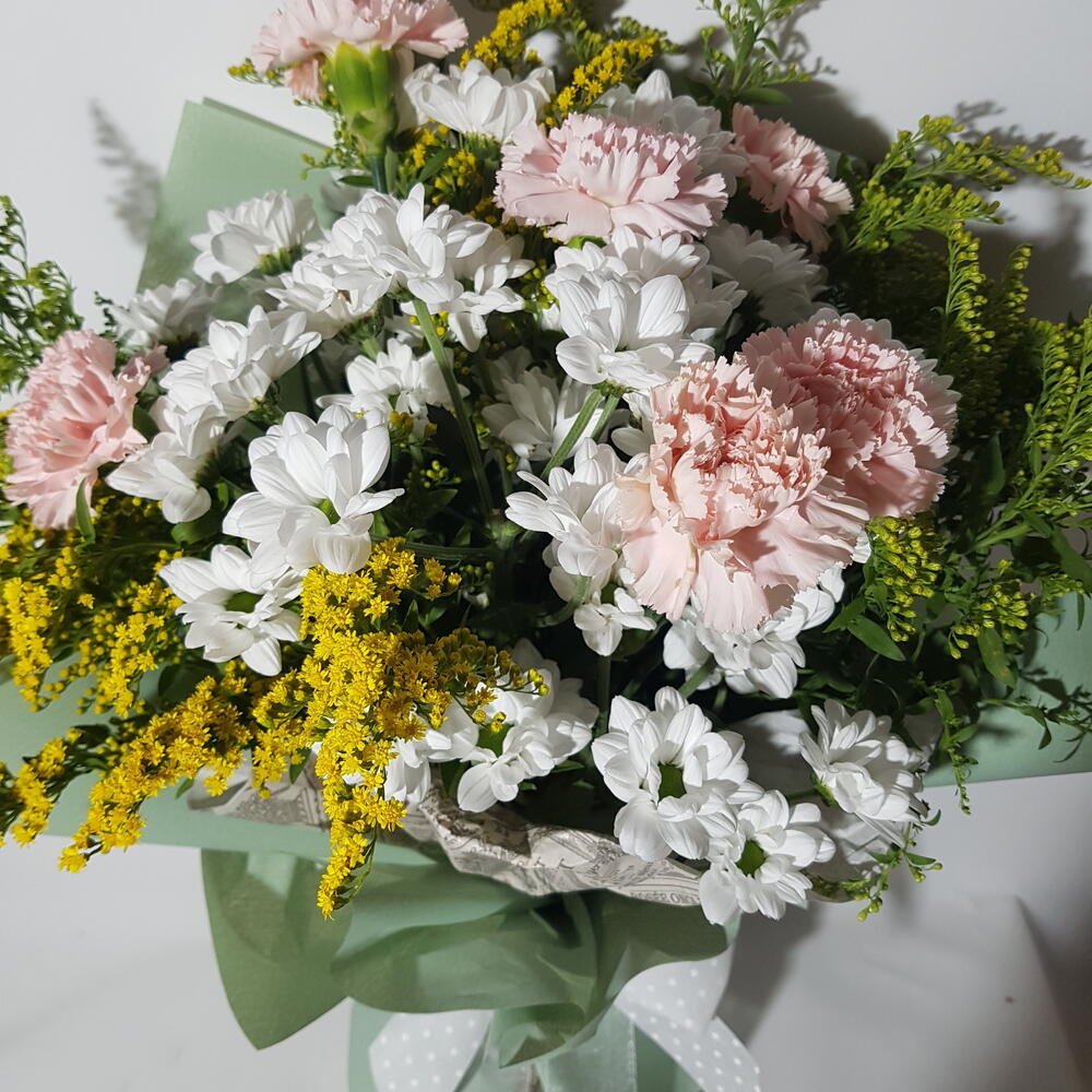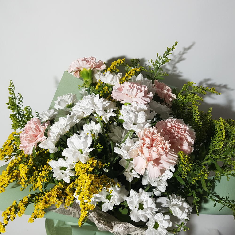 Solidago - 6 ud. margaritas - 6 ud. claveles - 5 ud. verdes de temporada - 5 ud. pape coreano - 2 ud. papel grabado seda - 1 ud.