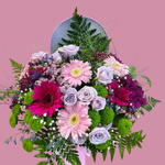 Aster - 3 ud. eucalipto - 3 ud. rosas blancas - 6 ud. Gerbera fucsia - 1 ud. helecho de cuero - 7 ud. rosas lila - 6 ud. gerbera rosa claro - 3 ud. gerbera burdeos - 1 ud. crisantemos verdes “button - 5 ud. crisantemos mini burdeos - 4 ud. relleno verde adicional - 2 ud.