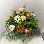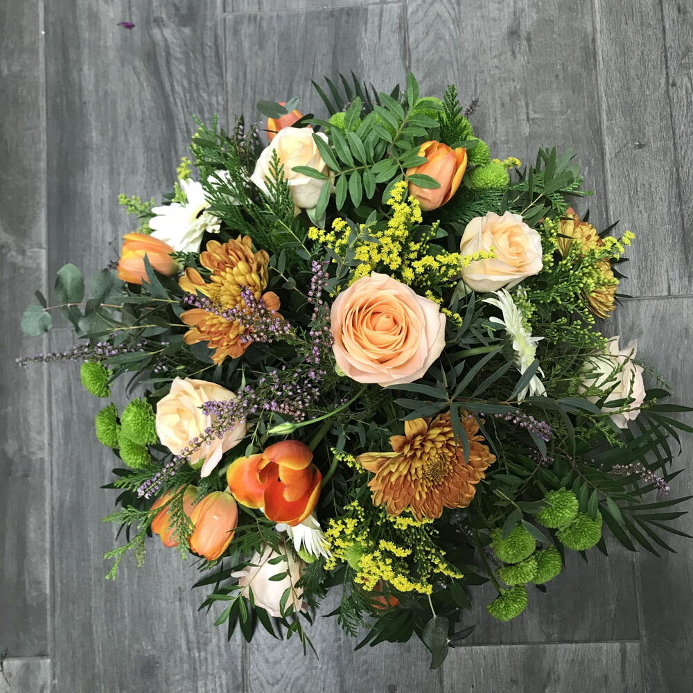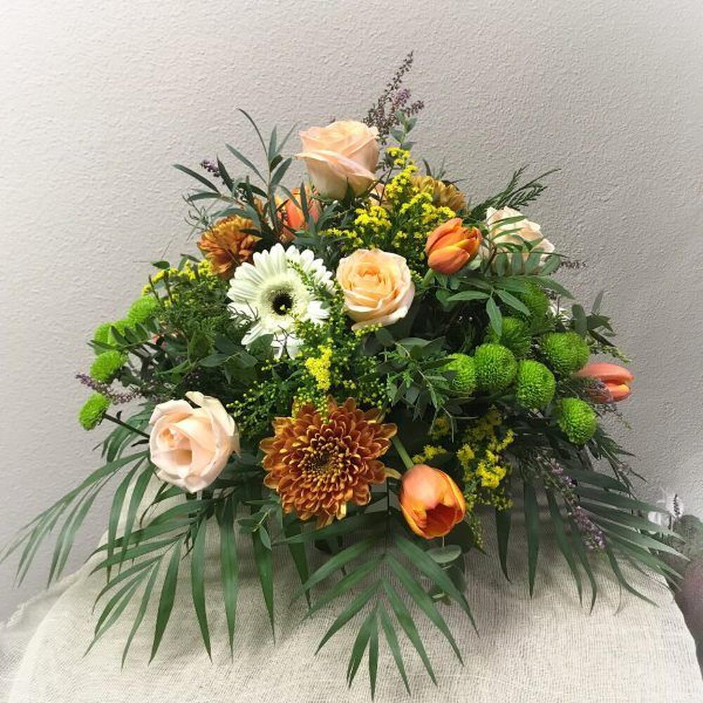 eucalipto - 2 ud. Gerbera blancas - 2 ud. tulipanes naranjas - 5 ud. rosas melocotón - 6 ud. solidago amarillo - 3 ud. crisantemos verdes botón - 3 ud. hojas de palmera - 2 ud. crisantemos bronce - 3 ud.