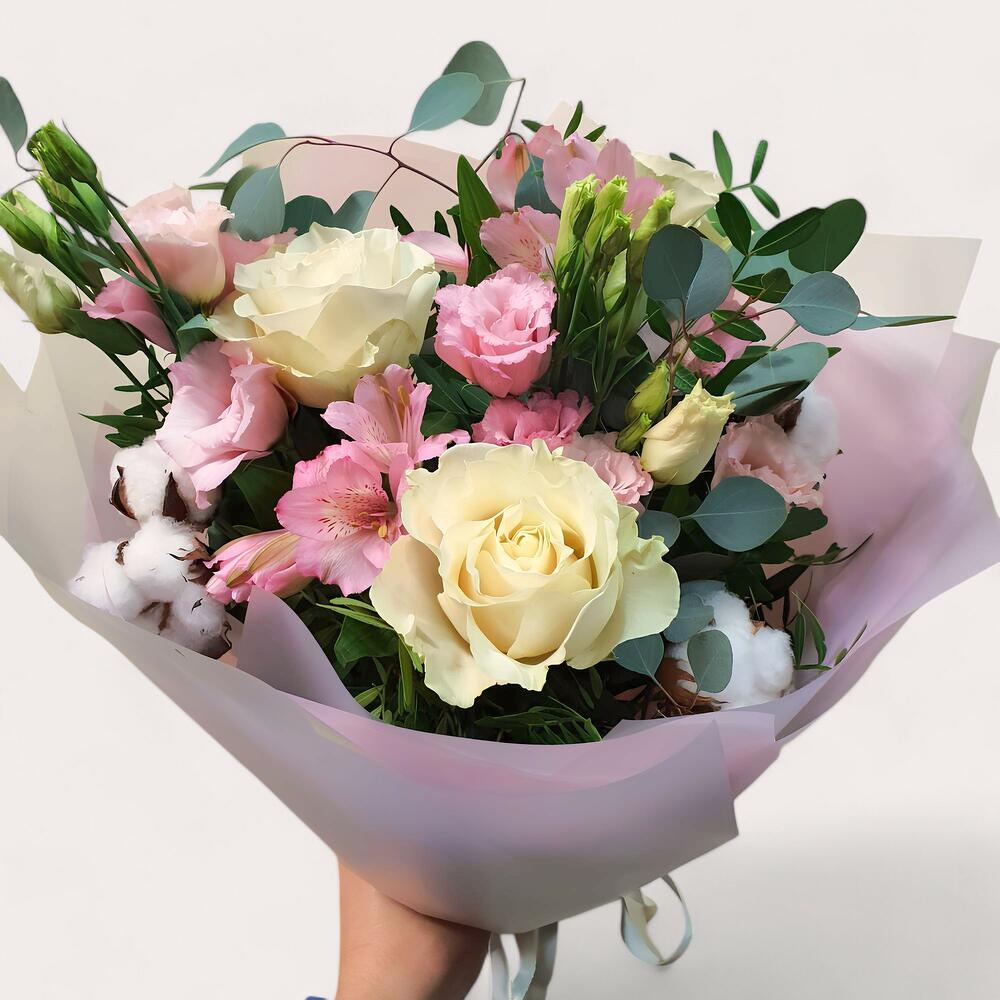 Descubre la delicadeza de este encantador ramo, compuesto por rosas crema y rosa, alstroemerias suaves, eustomas frescas y un toque de algodón. Las ramas de eucalipto y un envoltorio translúcido en tonos pastel completan el diseño, transmitiendo una atmósfera de elegancia y ternura. Perfecto para expresar amor, gratitud o simplemente para alegrar el día de alguien especial.