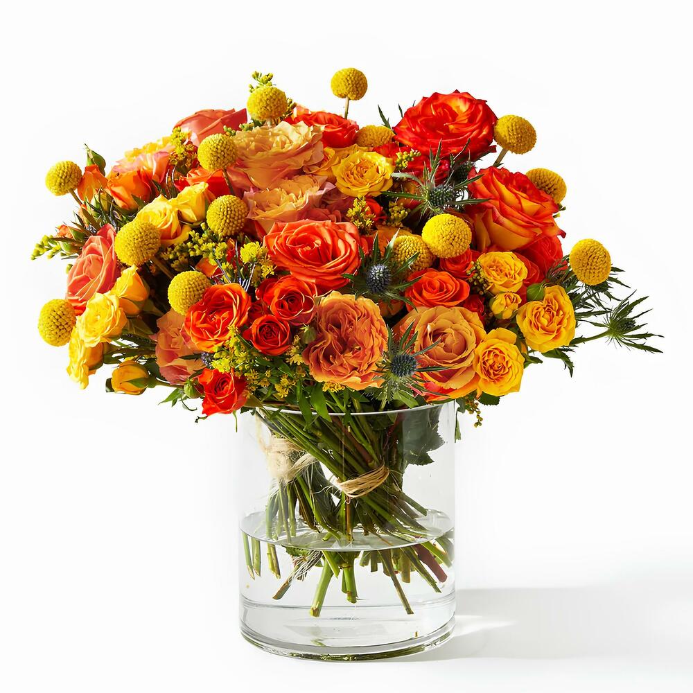 Un estallido de color y energía. Este ramo lleno de tonos cálidos como el naranja, amarillo y dorado evoca alegría, optimismo y vitalidad. Ideal para regalar en celebraciones, para levantar el ánimo o iluminar cualquier estancia. 📝 Nota importante: El jarrón no está incluido.