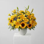 Este encantador arreglo floral de autor es una oda a los tonos soleados del amarillo. Compuesto por tres girasoles, resplandecientes en su gloria, se complementa con cuatro liliums amarillos y tres rosas del mismo tono. Los tres ranúnculos amarillos y cuatro claveles amarillos suman profundidad al diseño, mientras que los crisantemos amarillos se distribuyen con gracia. El cardo azul y el Verde decorativo aportan un hermoso contraste, y la paniculata blanca y tres ramas de eucalipto suavizan la composición con su delicadeza. Este extraordinario arreglo floral es la representación perfecta del verano en plena floración.