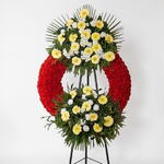 Esta solemne corona floral combina la intensidad del rojo con la suavidad de los tonos crema y blancos, creando un homenaje lleno de respeto, paz y memoria eterna. Las flores claras simbolizan pureza y serenidad, mientras que el aro rojo expresa amor profundo y recuerdo imborrable. Su diseño equilibrado transmite armonía y consuelo, ofreciendo un mensaje silencioso de apoyo y solidaridad en momentos difíciles. El abundante follaje verde aporta un contraste natural que representa esperanza y continuidad de la vida. La composición vertical realza su presencia, convirtiéndola en un tributo digno y elegante. Es una elección apropiada para funerales, velatorios, ceremonias conmemorativas y homenajes de despedida. Para mantener su frescura, se recomienda colocarla en un lugar fresco, evitar la luz solar directa, rociar ligeramente las flores con agua y retirar las partes marchitas cuando sea necesario.