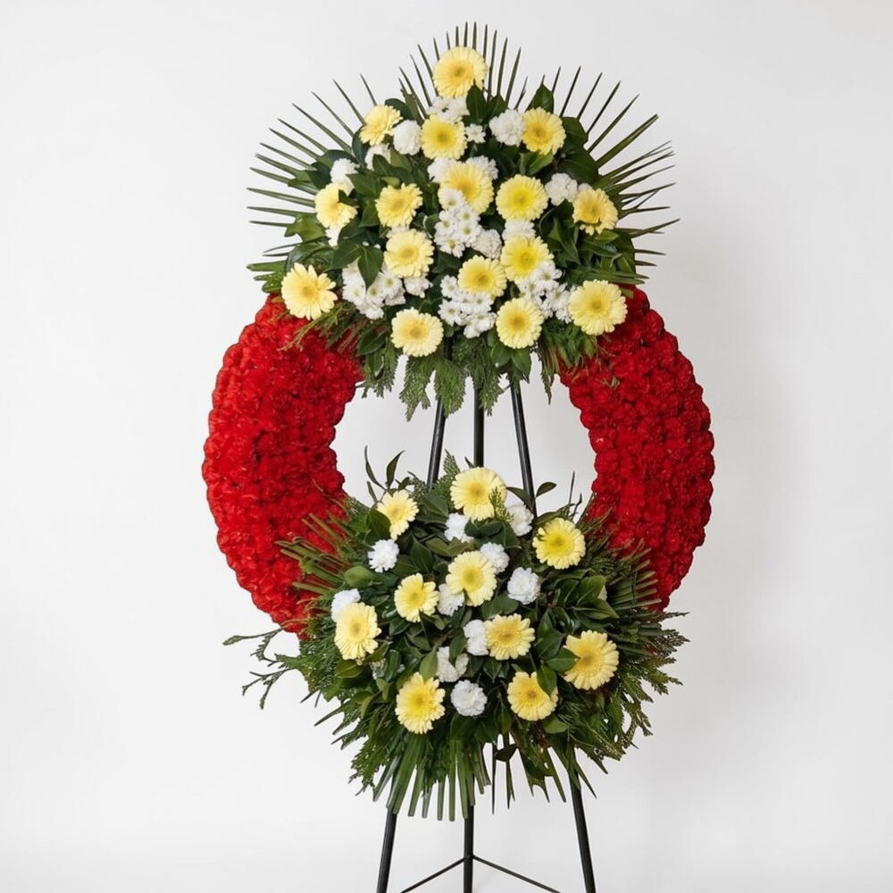 Esta solemne corona floral combina la intensidad del rojo con la suavidad de los tonos crema y blancos, creando un homenaje lleno de respeto, paz y memoria eterna. Las flores claras simbolizan pureza y serenidad, mientras que el aro rojo expresa amor profundo y recuerdo imborrable. Su diseño equilibrado transmite armonía y consuelo, ofreciendo un mensaje silencioso de apoyo y solidaridad en momentos difíciles. El abundante follaje verde aporta un contraste natural que representa esperanza y continuidad de la vida. La composición vertical realza su presencia, convirtiéndola en un tributo digno y elegante. Es una elección apropiada para funerales, velatorios, ceremonias conmemorativas y homenajes de despedida. Para mantener su frescura, se recomienda colocarla en un lugar fresco, evitar la luz solar directa, rociar ligeramente las flores con agua y retirar las partes marchitas cuando sea necesario.