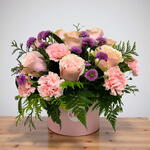 Sombrerera o box con 8 rosas rosadas, crisantemos, claveles y verdes. *Box disponible solo en color blanco.