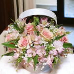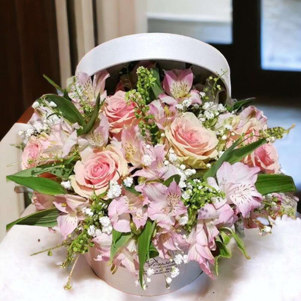 follaje verde - 4 ud. alstroemeria rosa - 3 ud. rosas rosas - 5 ud. paniculata blanca - 3 ud.