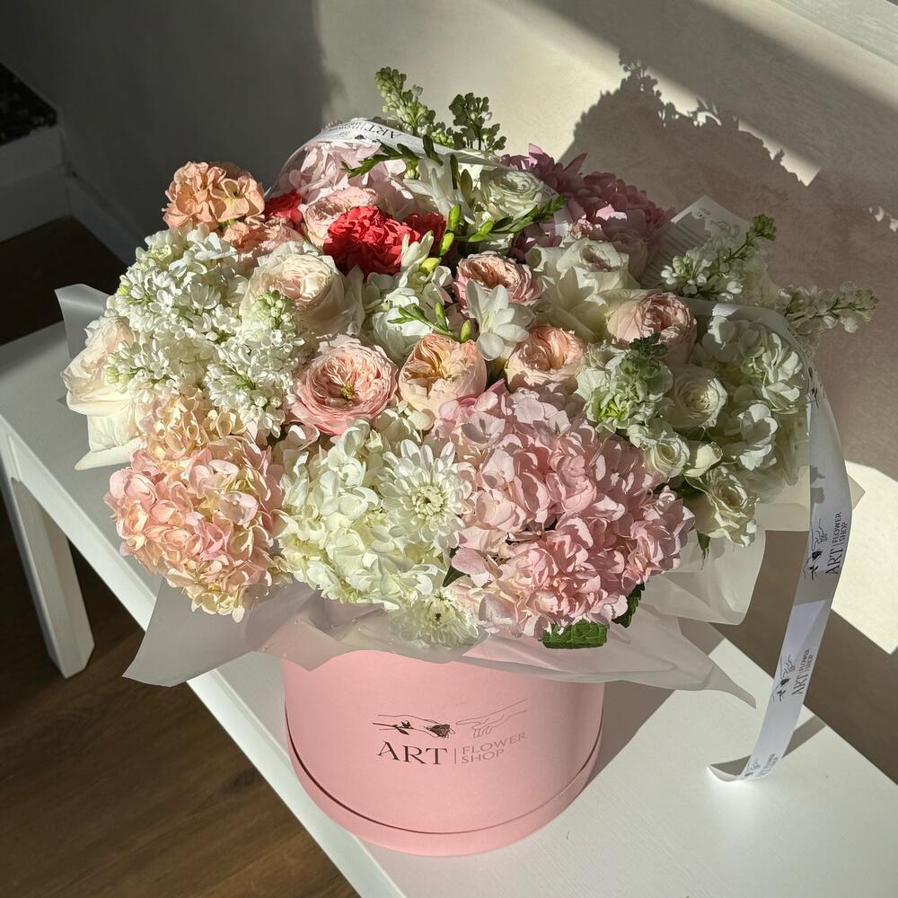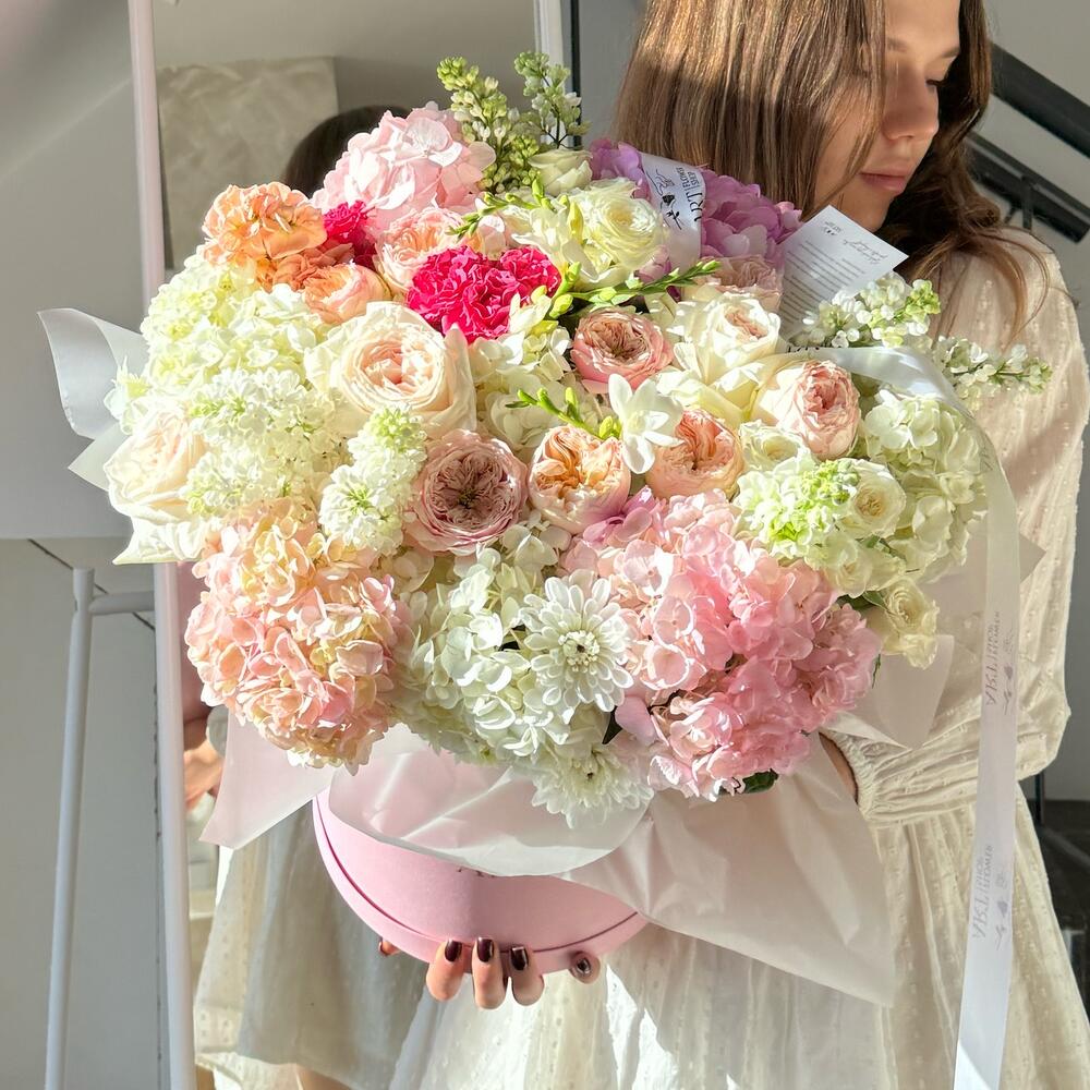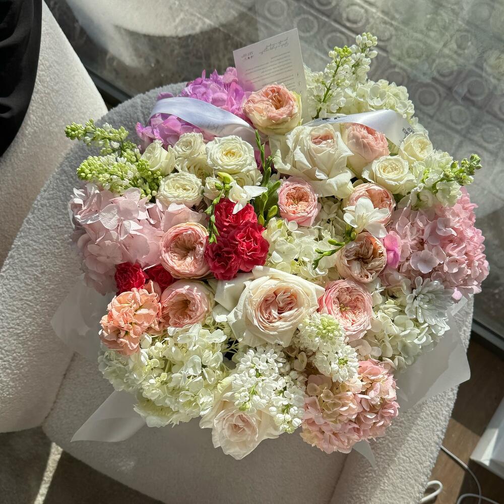Spray rose - 5 ud. Box - 1 ud. hortensia - 7 ud. fresia - 3 ud. garden rose - 10 ud. rosa o’hara - 4 ud. jeringa - 3 ud. martiola - 2 ud.