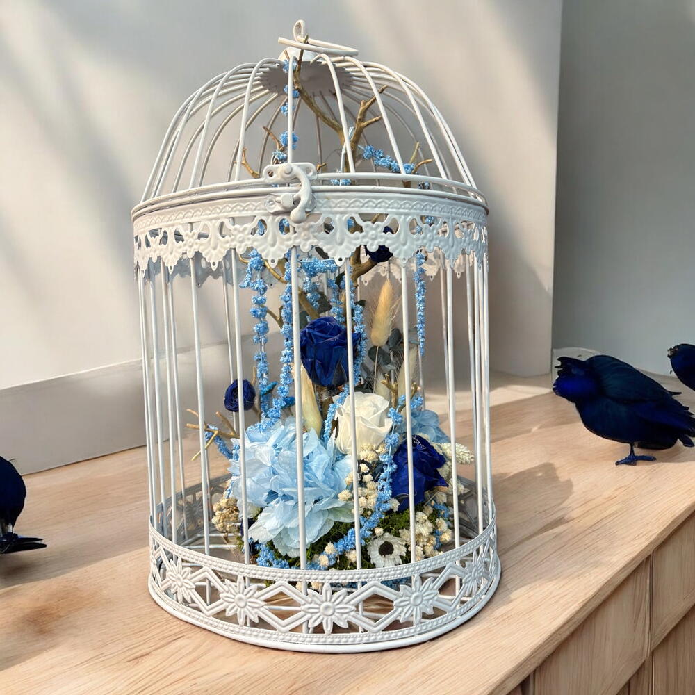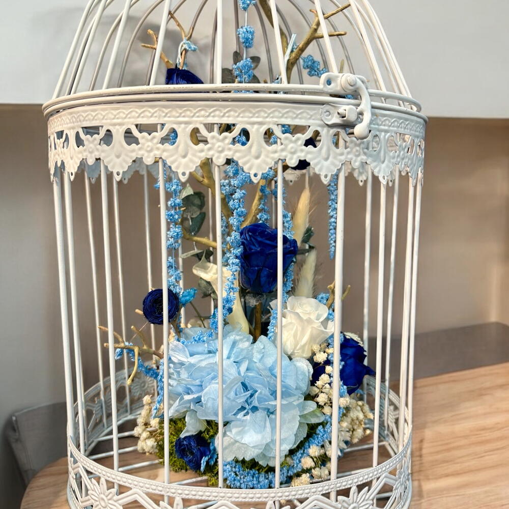 paniculata preservada - 3 ud. rosas preservadas - 7 ud. hala blanca de metal - 1 ud. cala preservada - 1 ud. hortensia azul preservada - 1 ud.