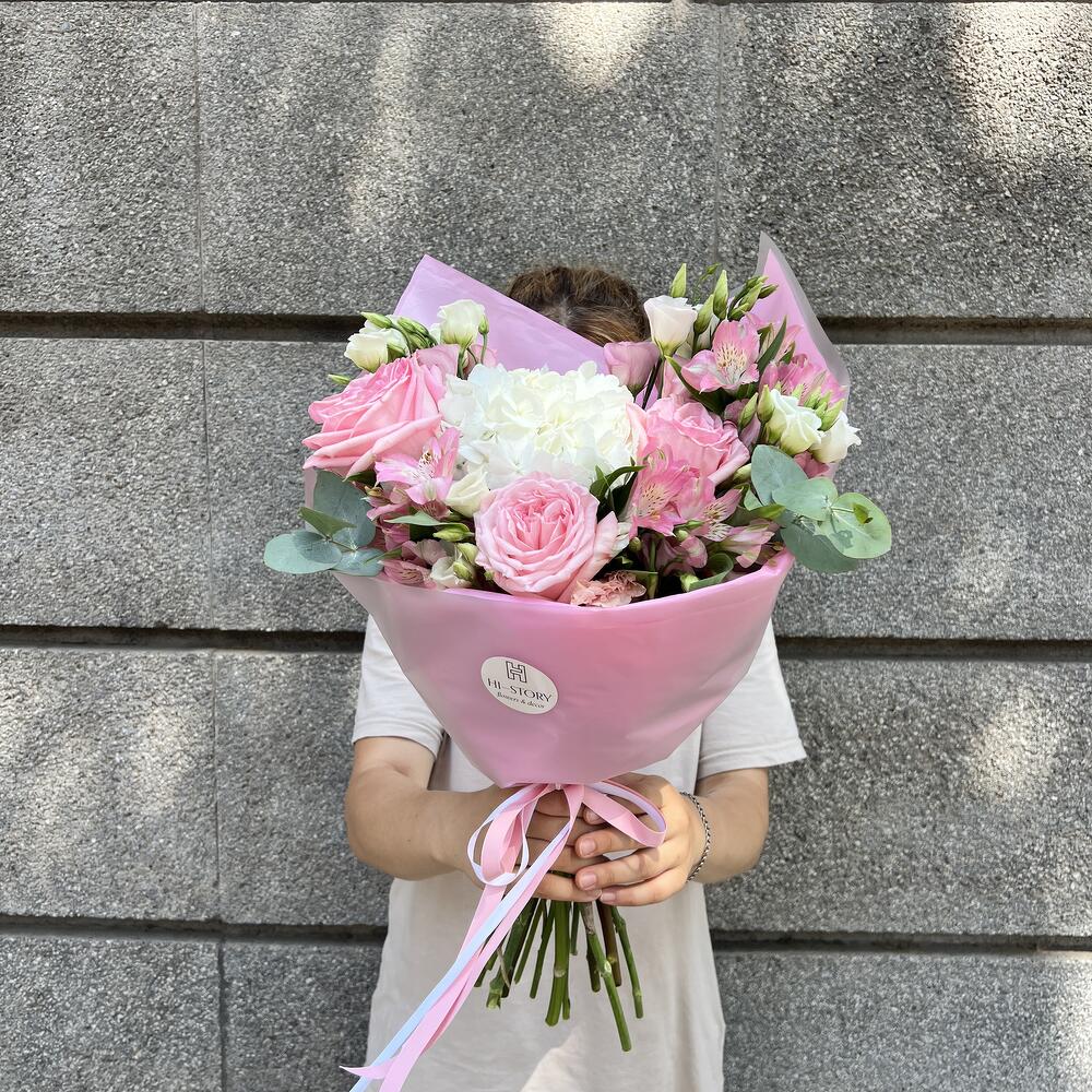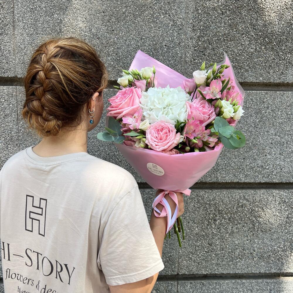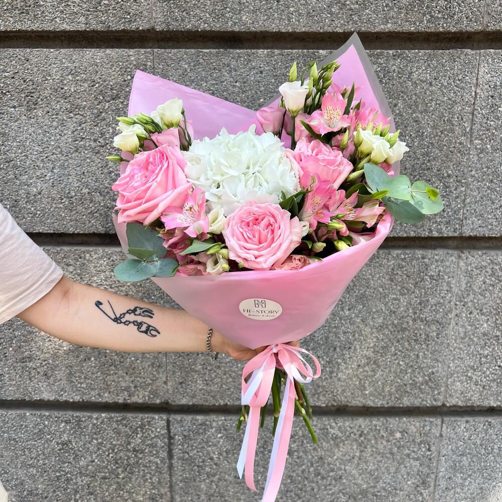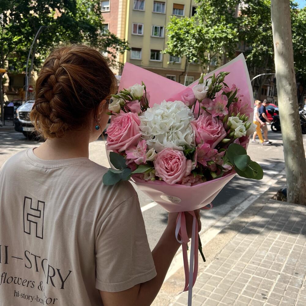 Eucalyptus - 1 ud. Alstroemeria - 3 ud. hortensia - 1 ud. Lisianthus - 3 ud. rosas - 3 ud.