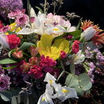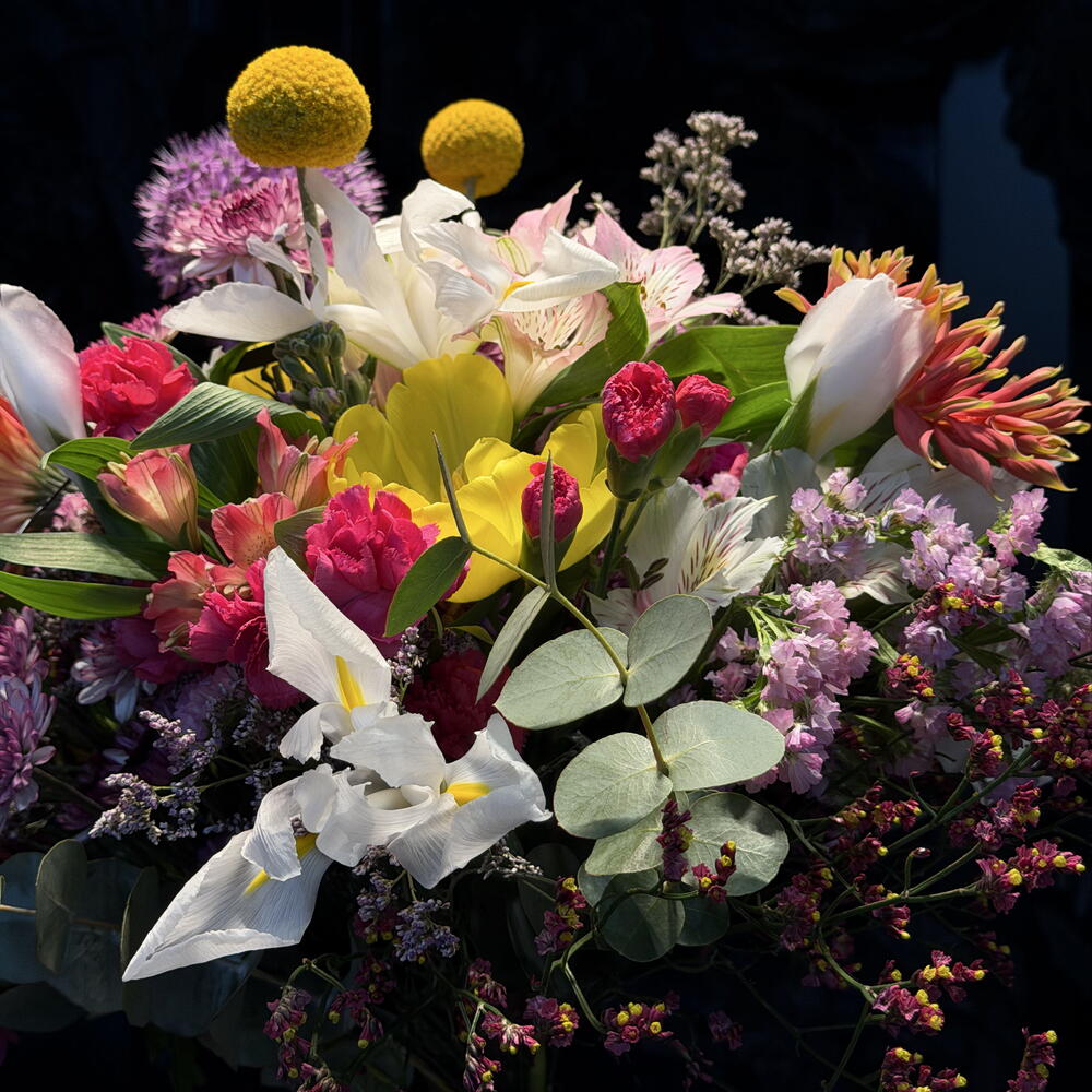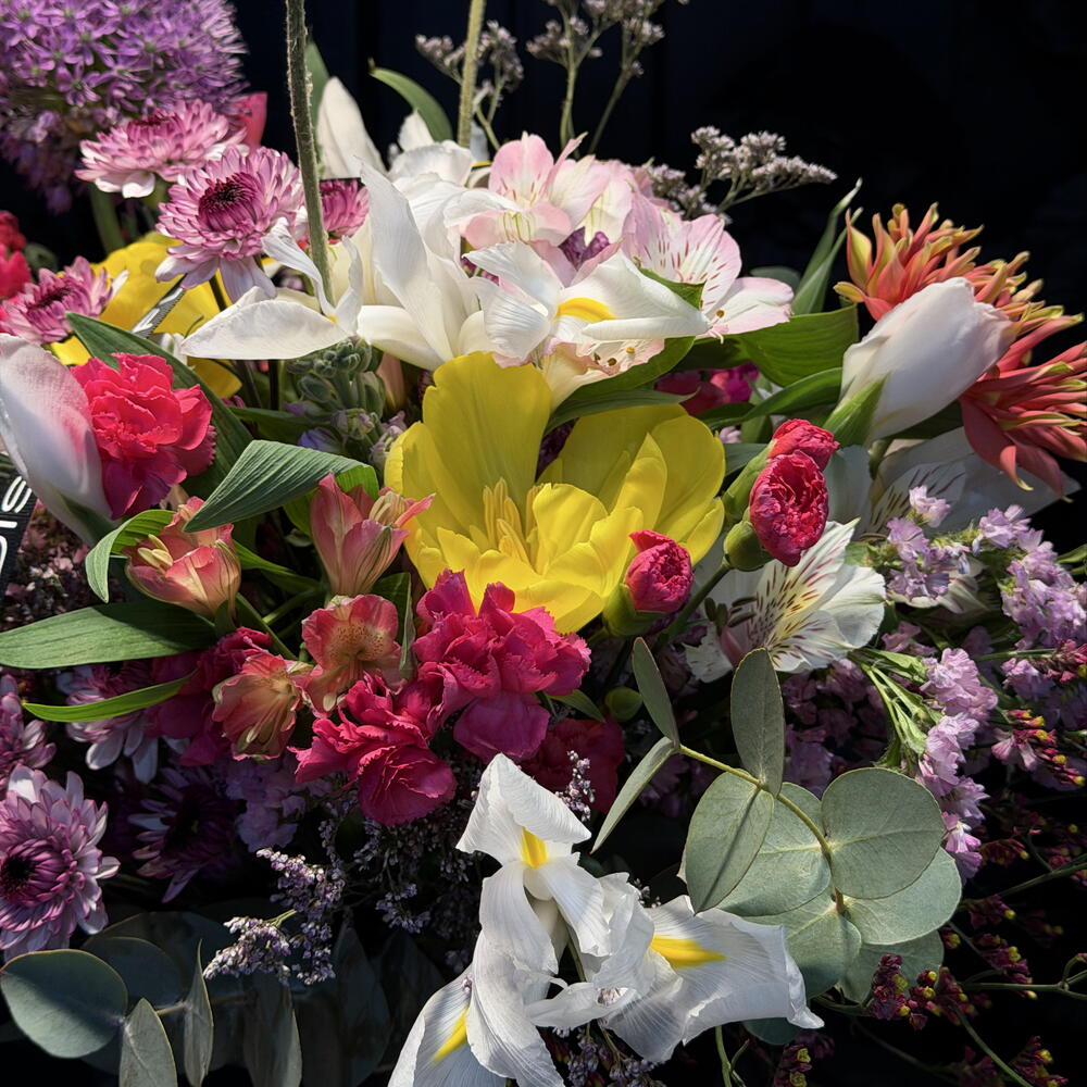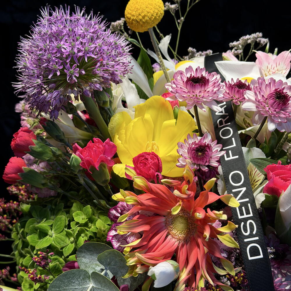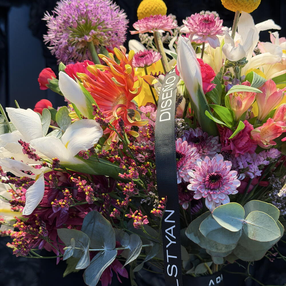 Estática - 3 ud. Limonium - 3 ud. Alstroemeria - 4 ud. Iris - 10 ud. tulipanes - 5 ud. eucalipto - 2 ud. clavel - 6 ud.
