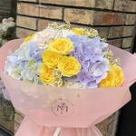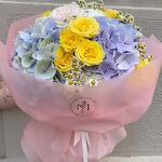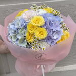 Este vibrante ramo combina la frescura de las hortensias en tonos azul lavanda con el brillo de las rosas amarillas y el delicado toque de las margaritas. Perfecto para alegrar cualquier espacio o sorprender a alguien especial, su diseño captura la esencia de la alegría y la elegancia en cada flor. Un regalo ideal para celebrar momentos inolvidables.