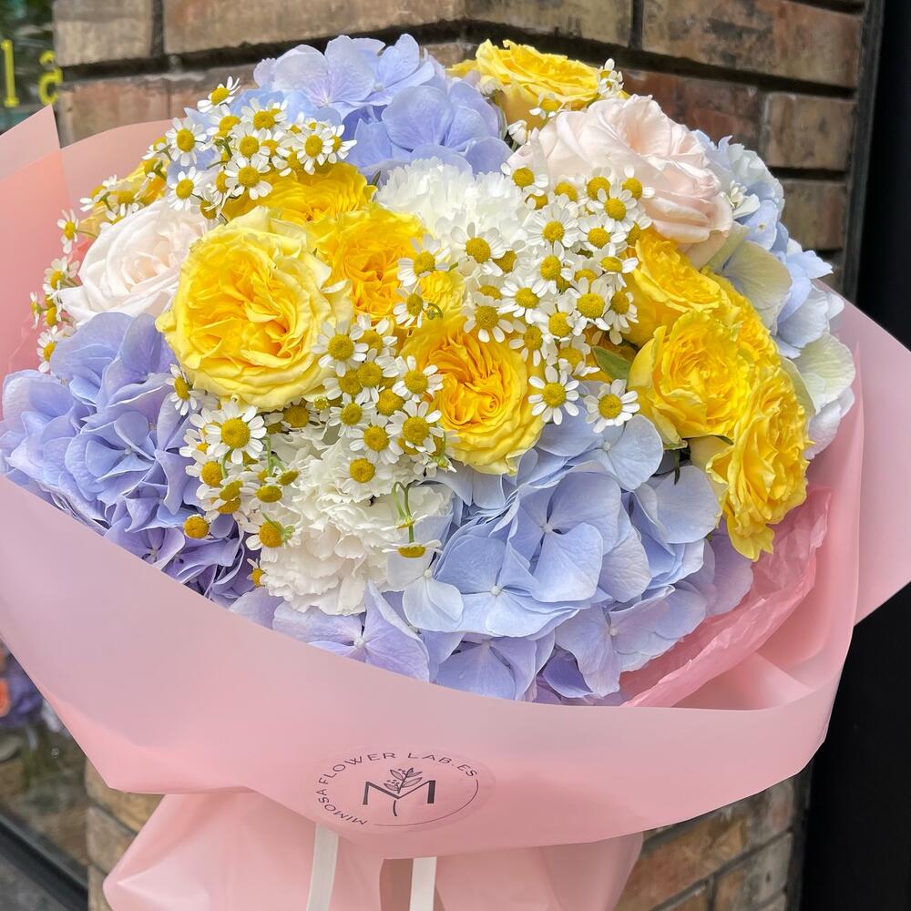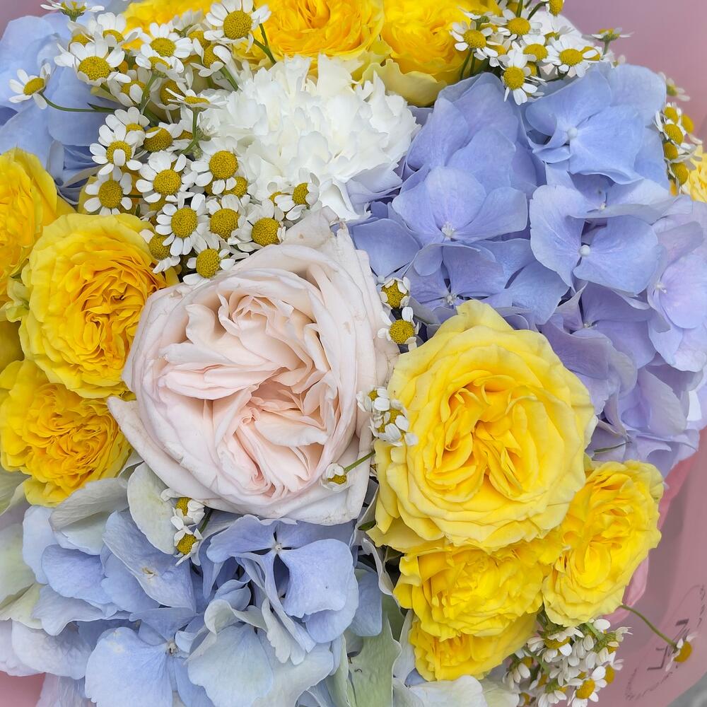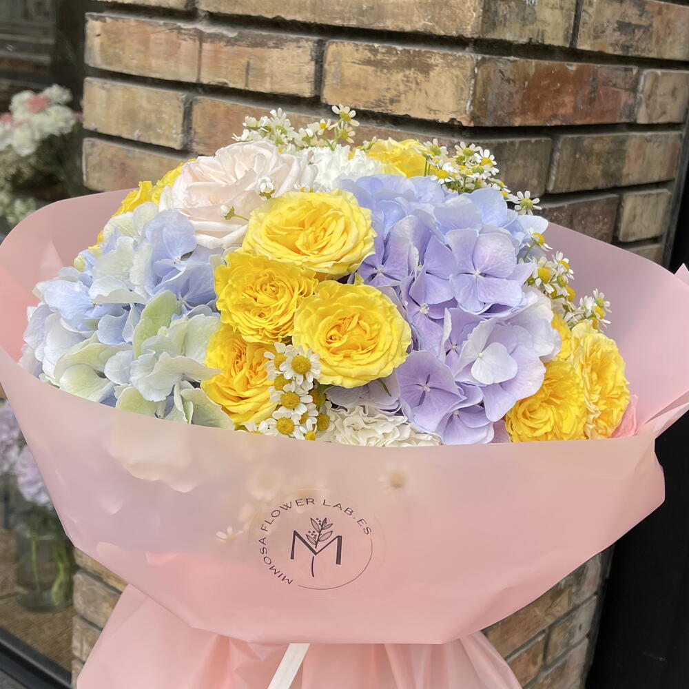 Este vibrante ramo combina la frescura de las hortensias en tonos azul lavanda con el brillo de las rosas amarillas y el delicado toque de las margaritas. Perfecto para alegrar cualquier espacio o sorprender a alguien especial, su diseño captura la esencia de la alegría y la elegancia en cada flor. Un regalo ideal para celebrar momentos inolvidables.
