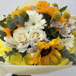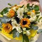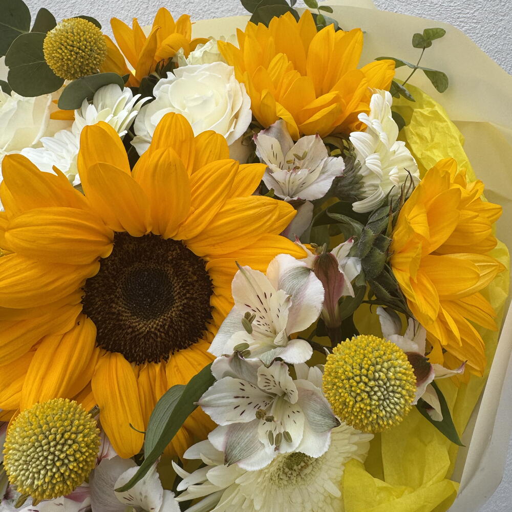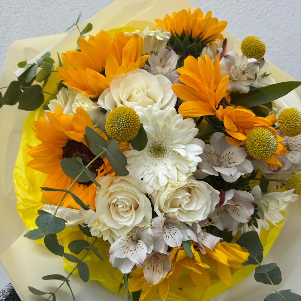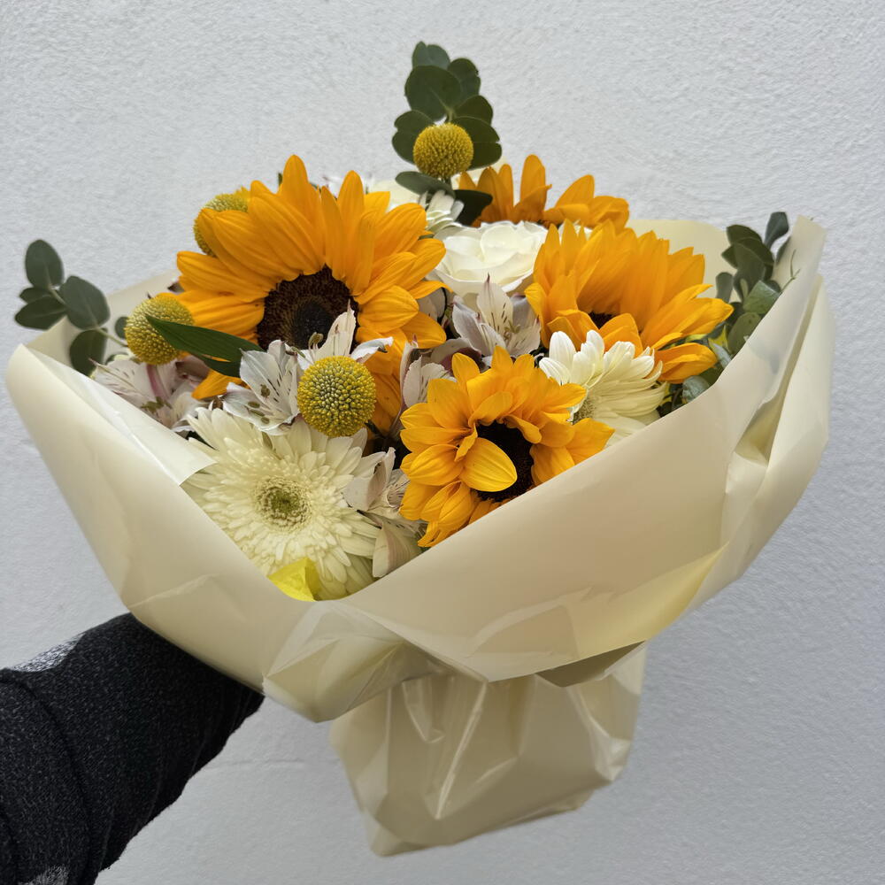 Gerbera - 4 ud. girasoles - 5 ud. craspedia - 5 ud. alstroemeria - 5 ud. roses - 5 ud.