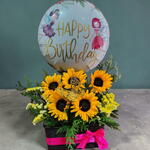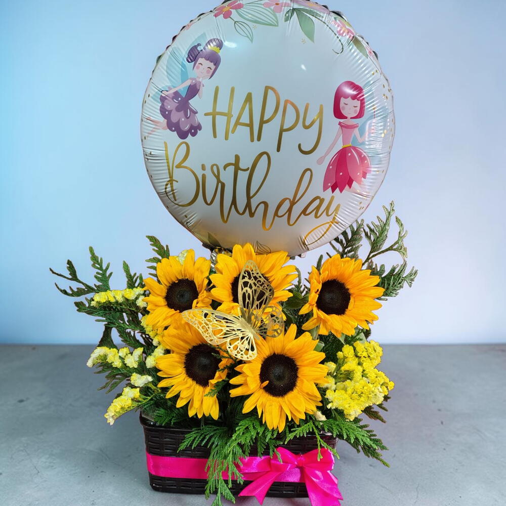 Regala esta hermosa e impactante cesta de 5 girasoles, con muchísimo follaje verde y decorativo amarillo para contrastar su belleza, además contiene un Globo Foil de 18 Pulgadas Personalizable para cualquier celebración, también incluye una hermosa mariposa en el centro del arreglo y una tarjeta dedicatoria para expresar tus sentimientos