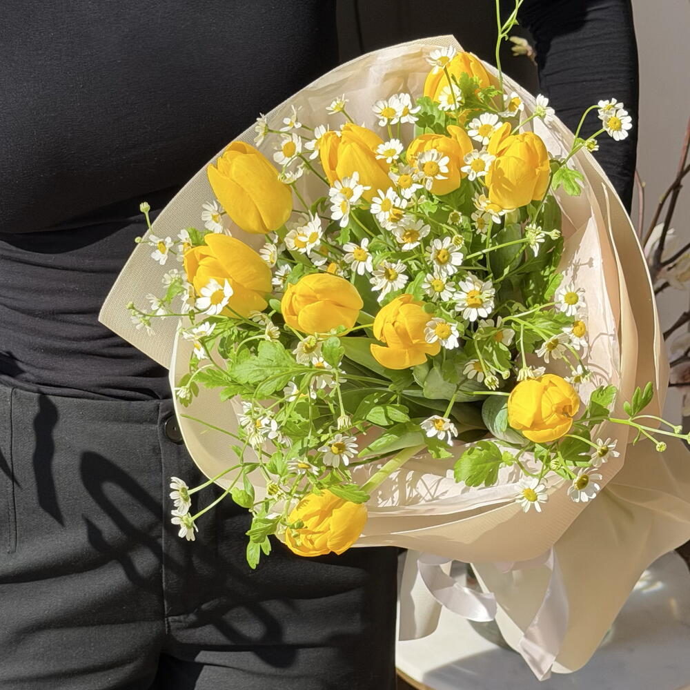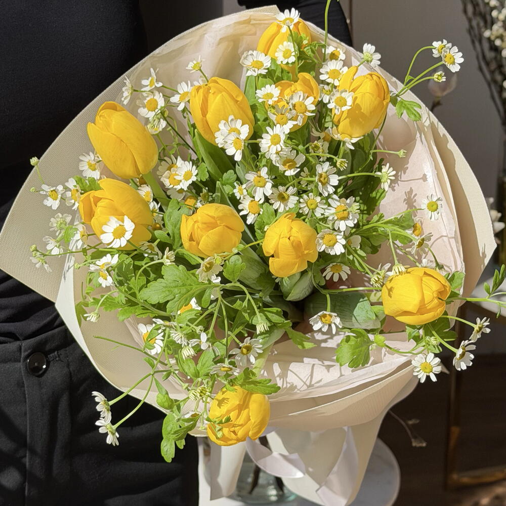 Este encantador arreglo de autor presenta una cuidada selección de 10 tulipanes y 5 tanacetums. Resalta por su armónico contraste de colores y frescura, evocando la alegría de la primavera. Perfecto para todo tipo de ocasiones, desde cumpleaños hasta celebraciones especiales, o simplemente para adornar tu espacio con un toque de belleza natural.