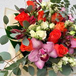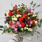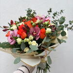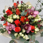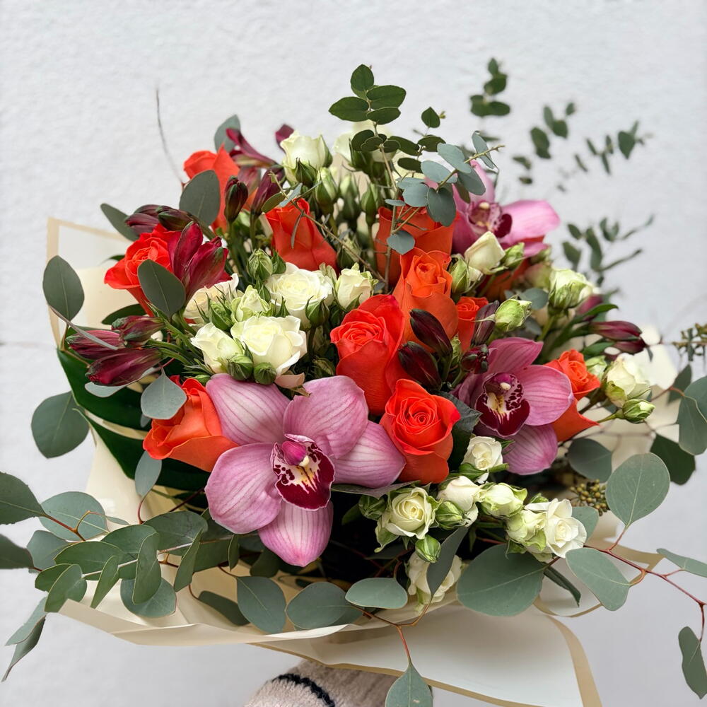 Spray rose - 5 ud. Alstroemeria - 6 ud. orchid cymbidium - 3 ud. orange rose - 10 ud. greenery mix - 1 ud.