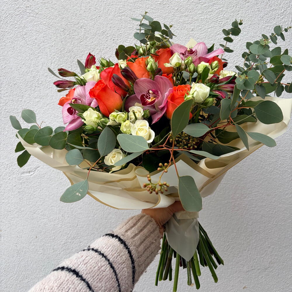Cautiva sus sentidos con este arreglo exuberante y vibrante. Combinando la belleza clásica de las rosas naranjas premium con la elegancia exótica de las orquídeas cymbidium, este ramo es una celebración de calidez y alegría. Rematado con delicadas rosas spray, alstroemerias de larga duración y eucalipto fresco, ofrece una textura rica y de múltiples capas que se ve impresionante desde cualquier ángulo. Perfecto para cumpleaños, aniversarios o para expresar un agradecimiento sincero, este ramo está envuelto profesionalmente en papel ecológico premium para garantizar que llegue como una verdadera obra de arte.