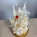 gipsofila - 15 ud. glixia - 15 ud. musgo preservado - 1 ud. helecho preservado - 7 ud. swarovski kris oso - 1 ud. hortensia preservada - 1 ud. helecho de espárrago preservado - 8 ud. siempreviva - 4 ud. cúpula de vidrio de color latón - 1 ud.
