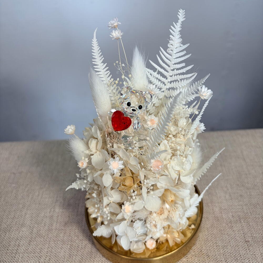 Captura un momento que perdurará. Este exquisito arreglo artesanal presenta el icónico oso Kris de Swarovski®, que brilla con facetas cortadas con precisión y sostiene un vibrante corazón rojo. Enclavado en un Jardín Nevado cuidadosamente seleccionado con hortensias preservadas, delicados helechos y delicadas plantas secas, esta pieza es una obra maestra de luz y textura. Alojado en una elegante campana de cristal de 20 cm con una sofisticada base dorada, este arreglo aporta un toque de elegancia boutique a cualquier espacio. Gracias a que las flores se preservan profesionalmente, mantendrán su belleza durante años sin una sola gota de agua ni luz solar. ¿Por qué elegir este regalo? • Lujo auténtico: Presenta un auténtico cristal Swarovski coleccionable. • Mantenimiento cero: Flores reales que se mantienen frescas todo el año. • Arte artesanal: Cada cúpula es un diseño floral único. • La declaración perfecta: Un regalo inolvidable para aniversarios, cumpleaños o para decir "Te amo" de una manera que nunca se desvanece.