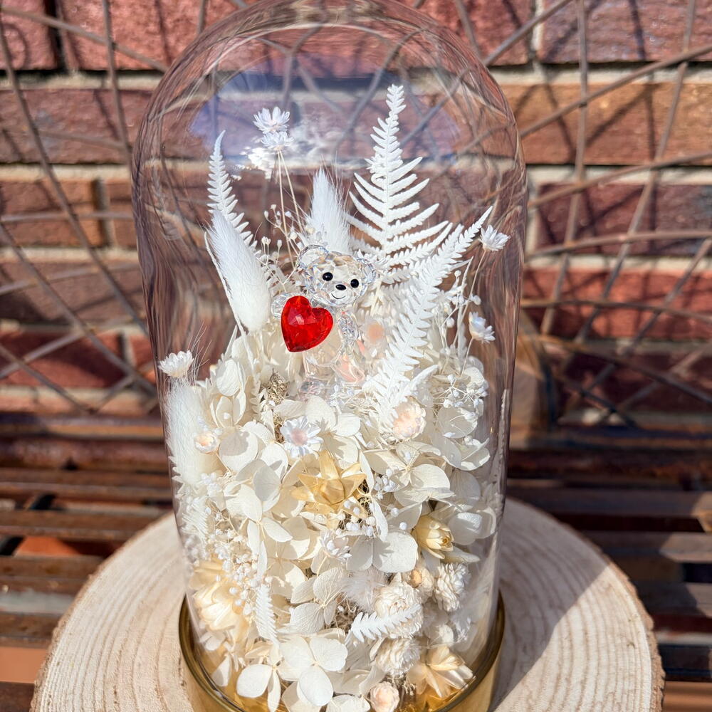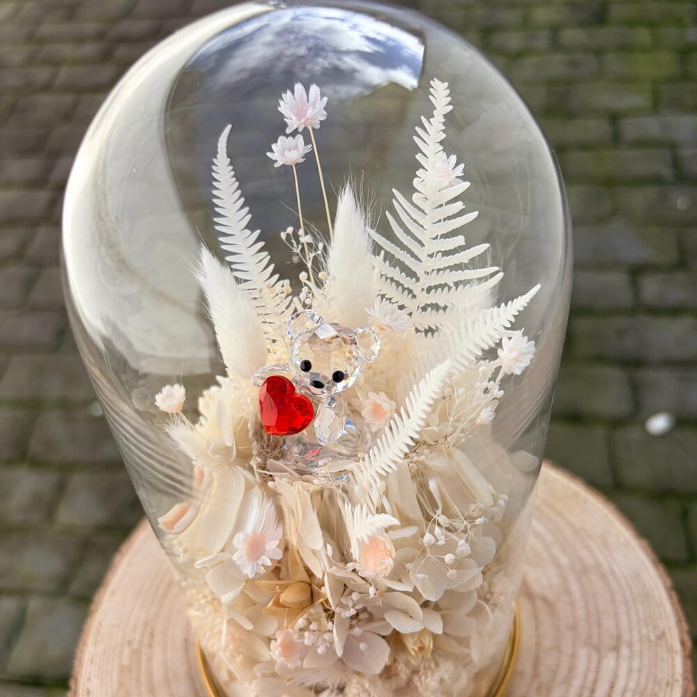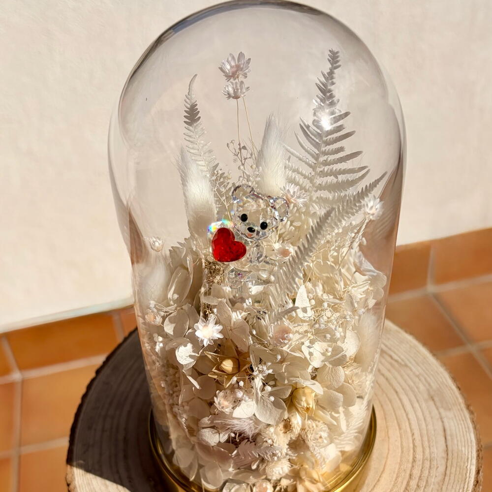 gipsofila - 15 ud. glixia - 15 ud. musgo preservado - 1 ud. helecho preservado - 7 ud. swarovski kris oso - 1 ud. hortensia preservada - 1 ud. helecho de espárrago preservado - 8 ud. siempreviva - 4 ud. cúpula de vidrio de color latón - 1 ud.