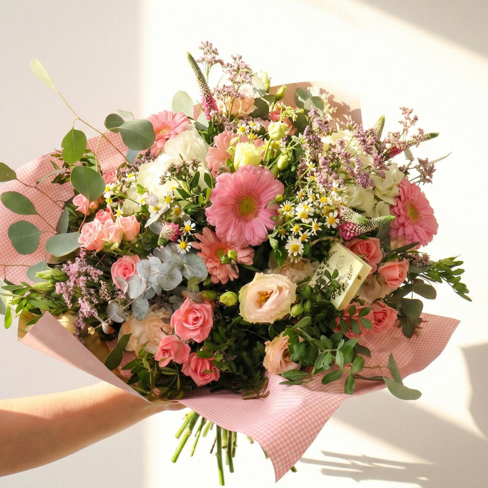 El Bouquet Rosa de Temporada “Encanto Rosado” es un ramo elegante y romántico elaborado con flores frescas en tonalidades rosadas, blancas y verdes naturales. Su combinación de hortensias, rosas, rosas pitiminí y flores silvestres de temporada crea una composición floral delicada, luminosa y llena de textura. Este ramo de flores rosadas con eucalipto es perfecto para transmitir cariño y ternura, convirtiéndose en un regalo ideal para cumpleaños, aniversarios, agradecimientos o cualquier ocasión especial. Los tonos suaves aportan una sensación de calma y elegancia, mientras que el eucalipto añade un toque natural y un aroma fresco característico.
