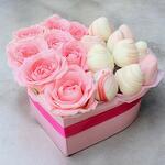La caja Dulce Romance es una combinación perfecta de belleza y sabor. Las delicadas rosas rosadas se presentan junto a fresas frescas bañadas en chocolate blanco, decoradas con un toque artístico en tonos pastel. Este regalo es ideal para expresar amor, ternura y admiración.