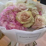 claveles blancos - 11 ud. hortensias fucsia - 3 ud. papel floral blanco impermeable - 2 ud. cintas combinadas de algodón ecológico - 1 ud. rosas seeet caroline - 7 ud.