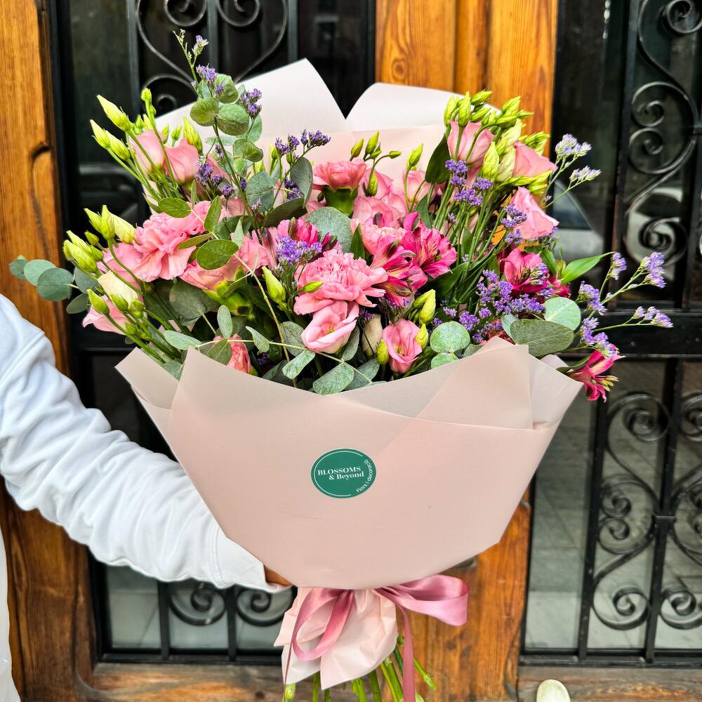 Este ramos clásicos es la perfecta mezcla de frescura y elegancia. Compuesto por 5 encantadores claveles, 2 ramas de delicado Limonium, 4 Lisianthus llenos de dulzura, 5 ramas de refrescante Eucalyptus y 5 vibrantes alstroemerias, este ramo es la elección perfecta para cualquier ocasión que requiera una muestra de cariño y sofisticación. Su cuidadoso diseño invita a los sueños y a la calma, evocando la belleza de la naturaleza en su máxima expresión. Ideal para regalar o simplemente para embellecer tu propio espacio.