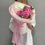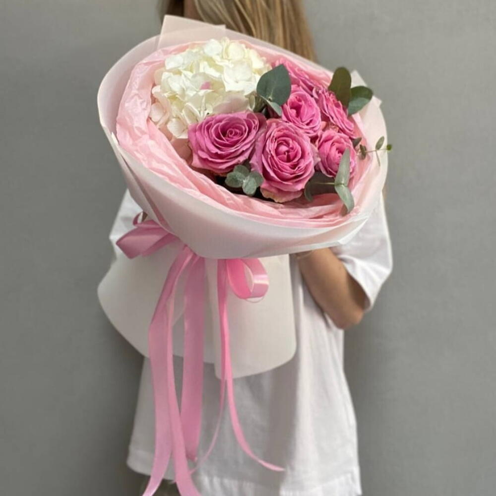 rosas rosadas - 8 ud. eucalipto preservado - 3 ud. hortensia blanca - 1 ud.