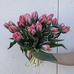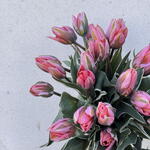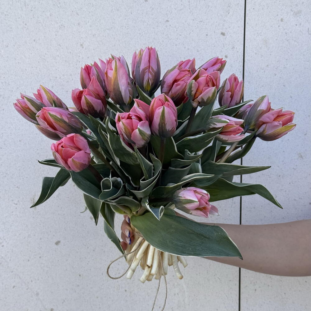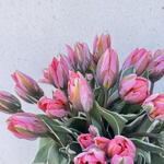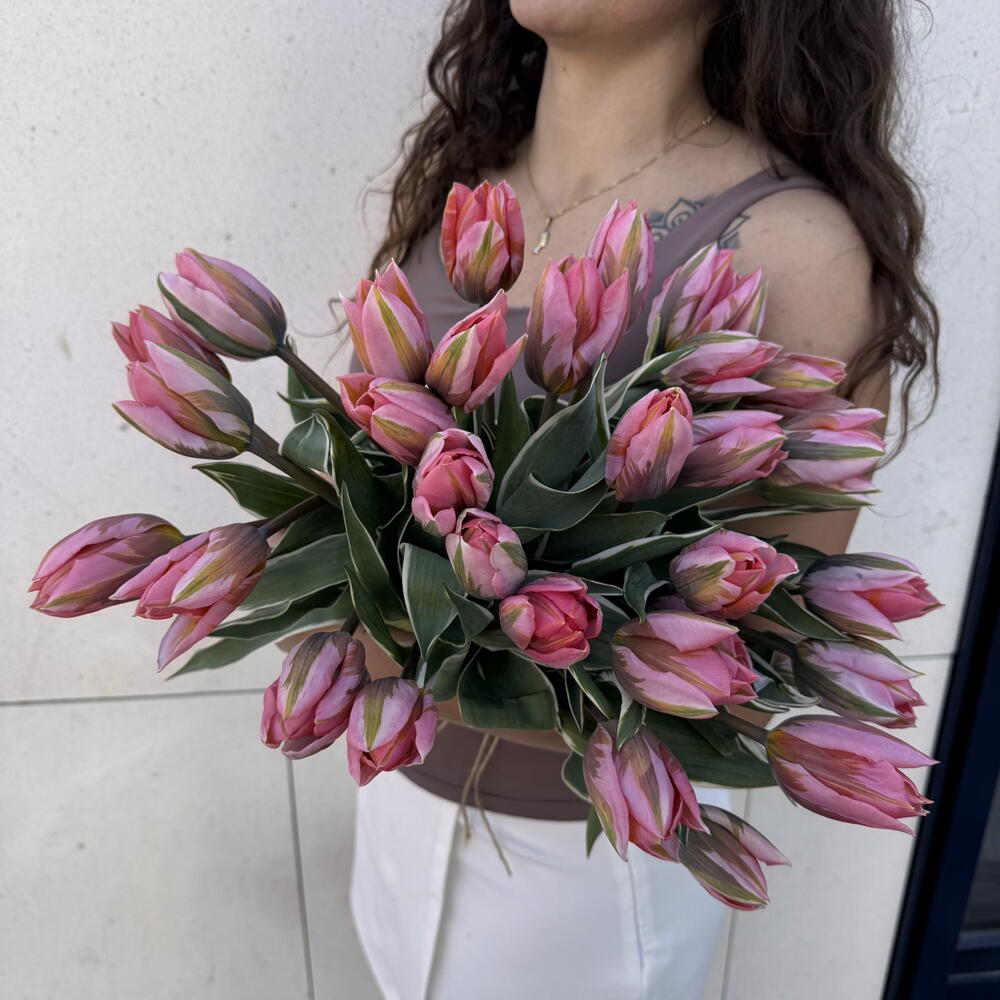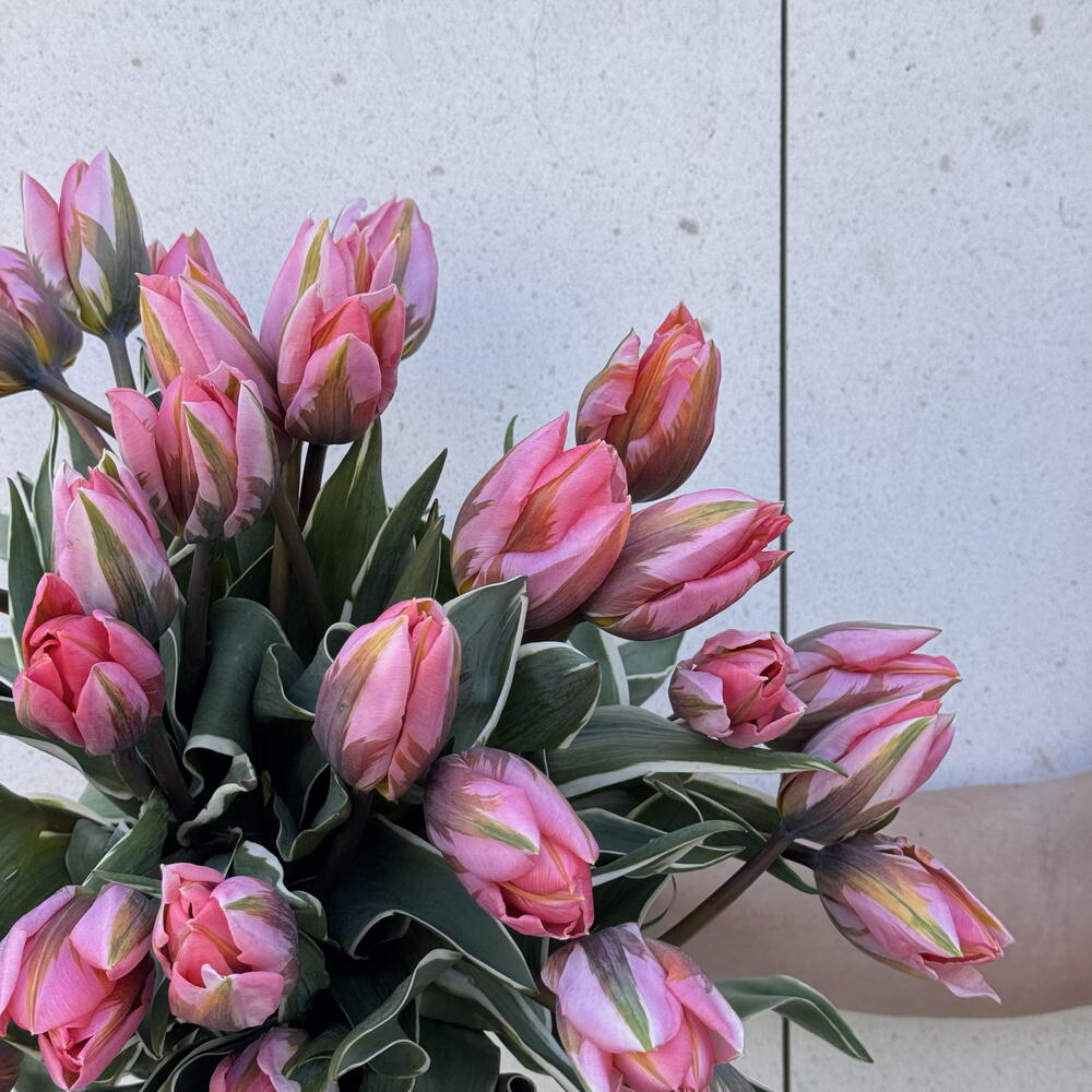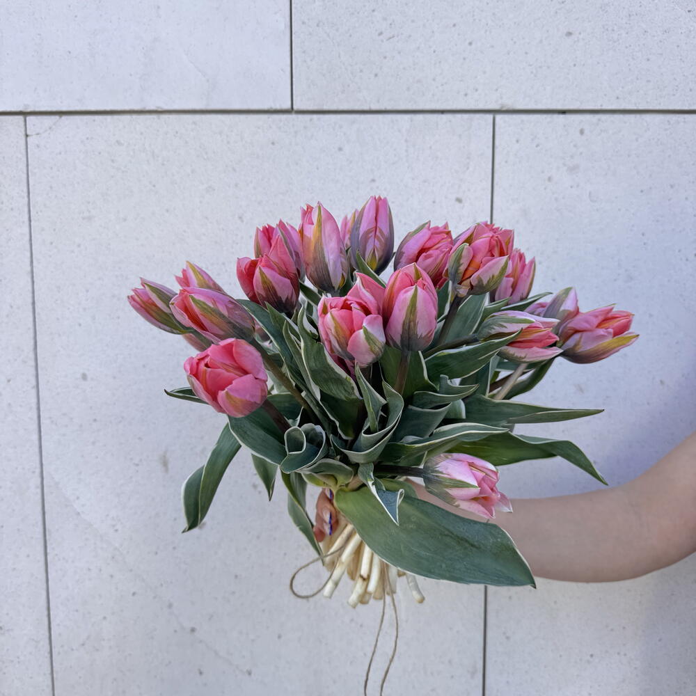 Tulipanes rosados frescos con hojas verdes que crean un contraste suave y natural. Un bouquet que transmite ternura y armonía. Ideal para regalar cariño y cercanía. Un clásico reinventado con estilo moderno.
