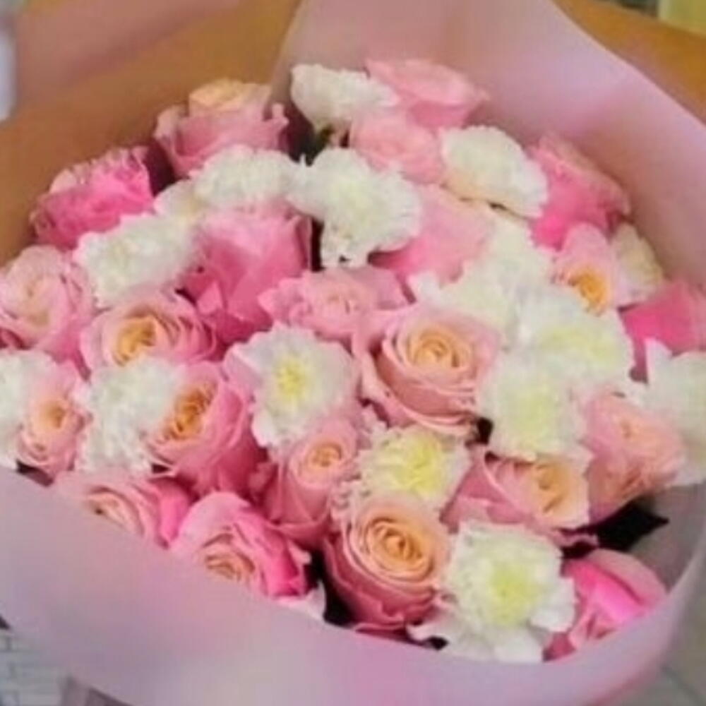 envoltorio a elegir - 2 ud. rosas pink - 25 ud. claveles blancos elegantes - 15 ud.