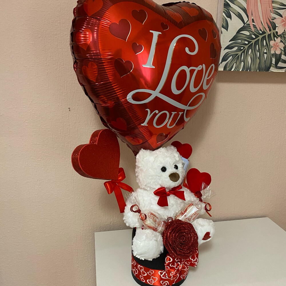 Raffaello - 4 ud. osito de peluche - 1 ud. caja decorativa - 1 ud. rosa eterna - 1 ud. corazón hecho a mano - 1 ud. globo 'te amo' - 1 ud. corazón decorativo - 2 ud.