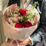 Red rose - 3 ud. Eucalyptus - 3 ud. Wax flower - 3 ud. pink spray rose - 1 ud. mattiola - 2 ud.