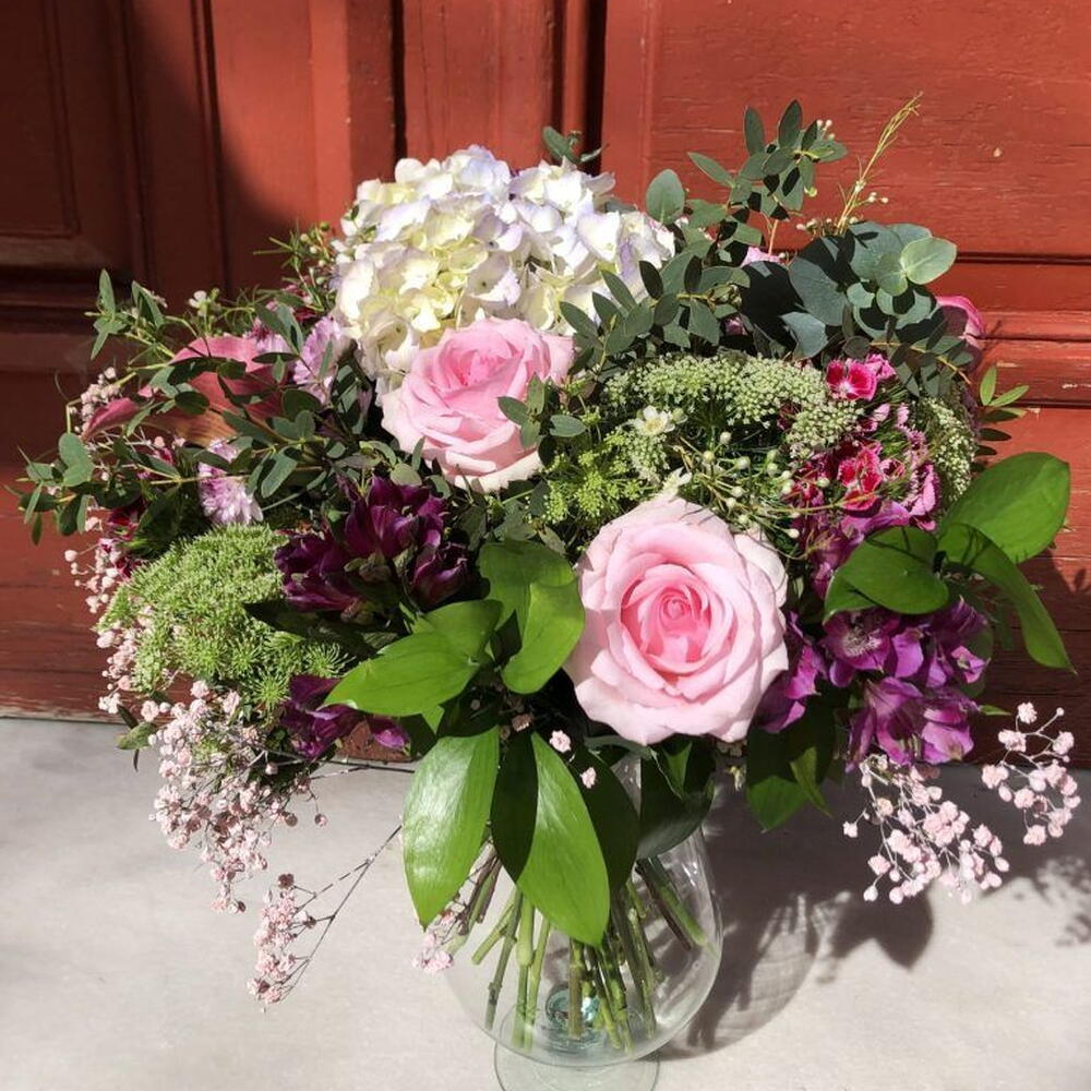 eucalipto - 3 ud. rosas rosadas - 3 ud. verdes variados - 3 ud. hortensia blanca - 1 ud. gypsophila rosa - 2 ud. alstroemerias moradas - 3 ud. zanahoria silvestre - 2 ud.