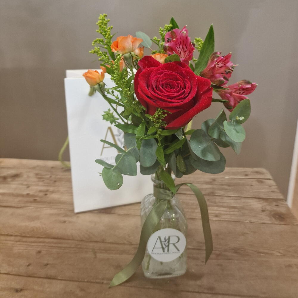 tarro de vidrio transparente de medidas aprx. 13 cms x 6 cms Rosa pink floyd acompañada de flores y follaje de temporada. Envueltas en las bolsas exclusivas de AR boutique floral