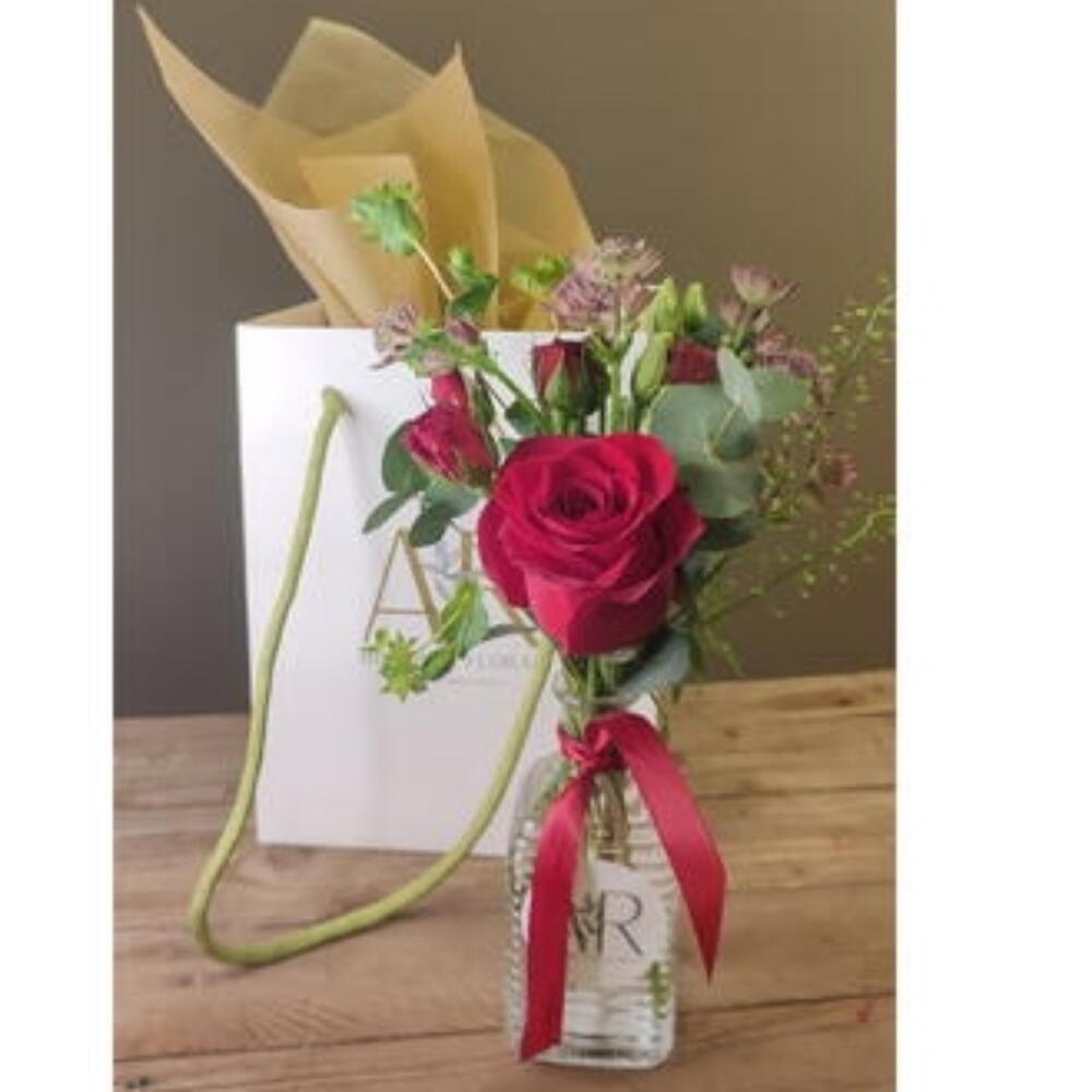 tarro de vidrio transparente de medidas aprx. 13 cms x 6 cms Flores rojas, fucsia y vinotinto de temporada Envueltas en las bolsas exclusivas de AR boutique floral