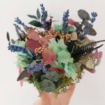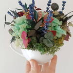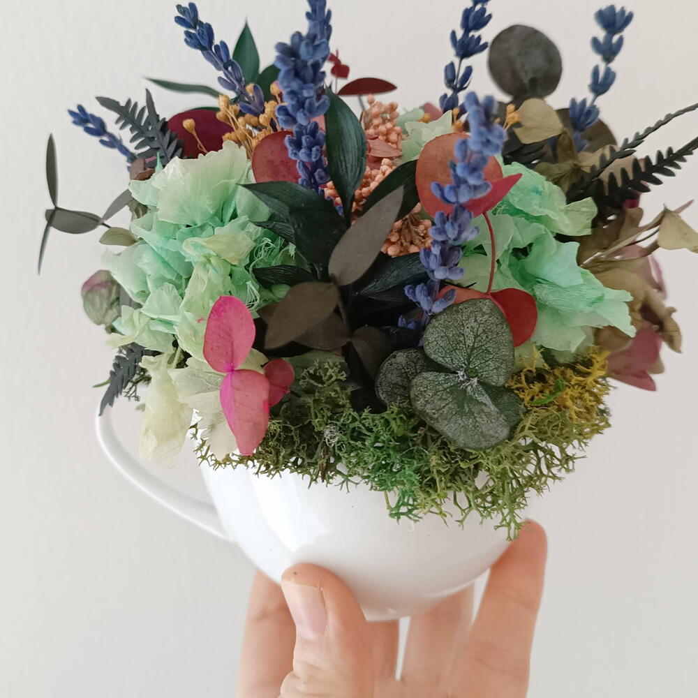 Taza decorativa con una cuidada selección de flores preservadas. Incluye eucalipto, musgo, lavanda y hortensias, creando una composición natural y duradera. Ideal como elemento decorativo para cualquier espacio.