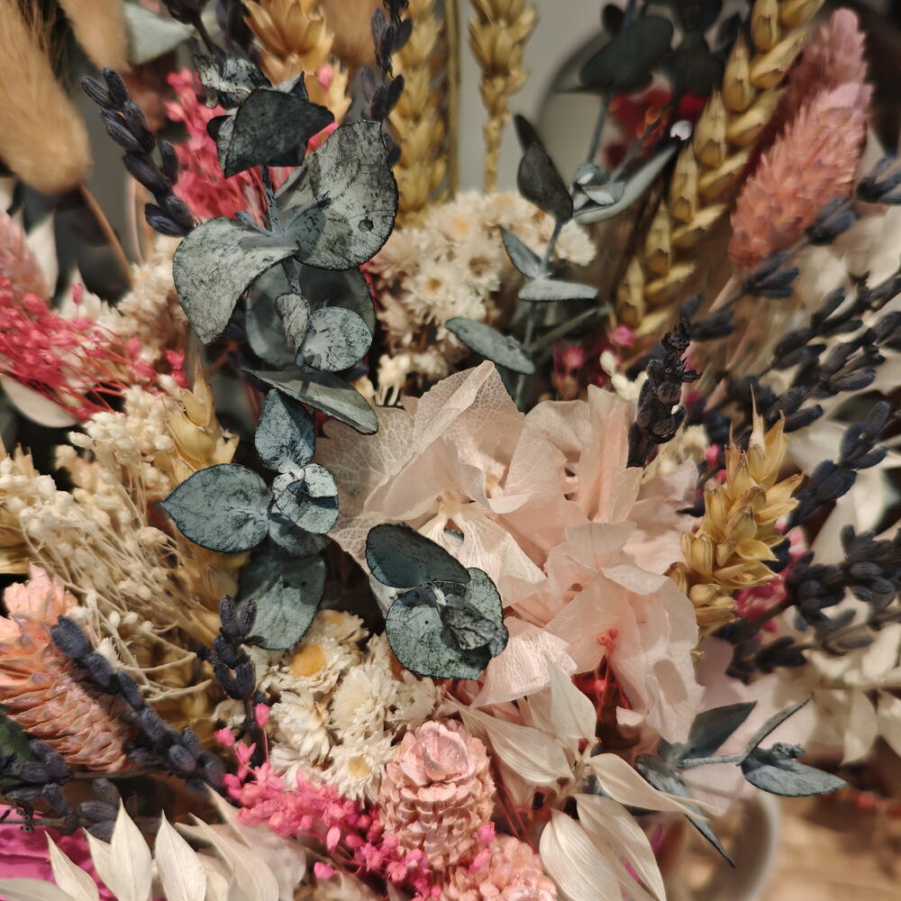 Ruscus - 3 ud. eucalipto preservado - 3 ud. hortensia preservada - 2 ud. espigas preservadas - 5 ud. broom preservado - 3 ud. taza ceramica - 1 ud.